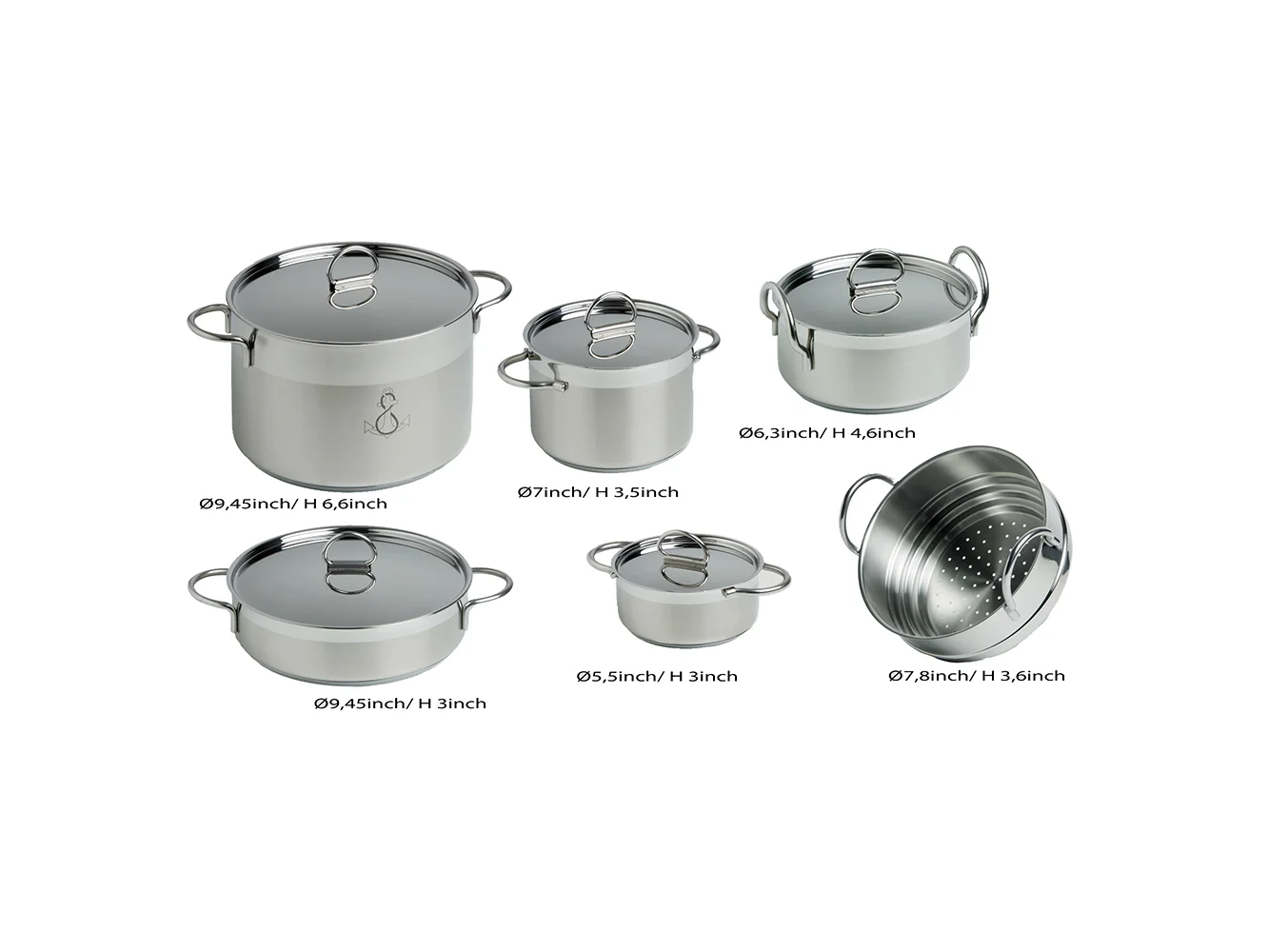 The set of 8 pans is made of top-quality stainless steel and has a heat diffusing bottom suitable for gas, ceramic hob, and induction.