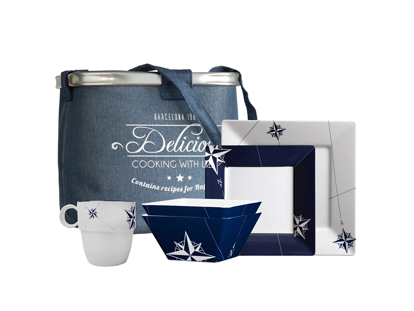 All the pieces are made from unbreakable melamine and come in the basket fastener that can be used to store the melamine tableware or as a fruit basket or to store other nautical accessories.