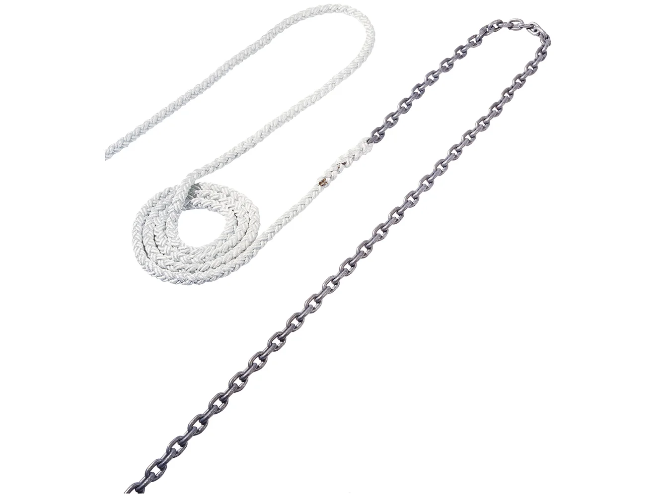 30 ft. of 5/16 in. HT spliced chain to 150 ft. of 5/8 in. Nylon Brait™ rope.
