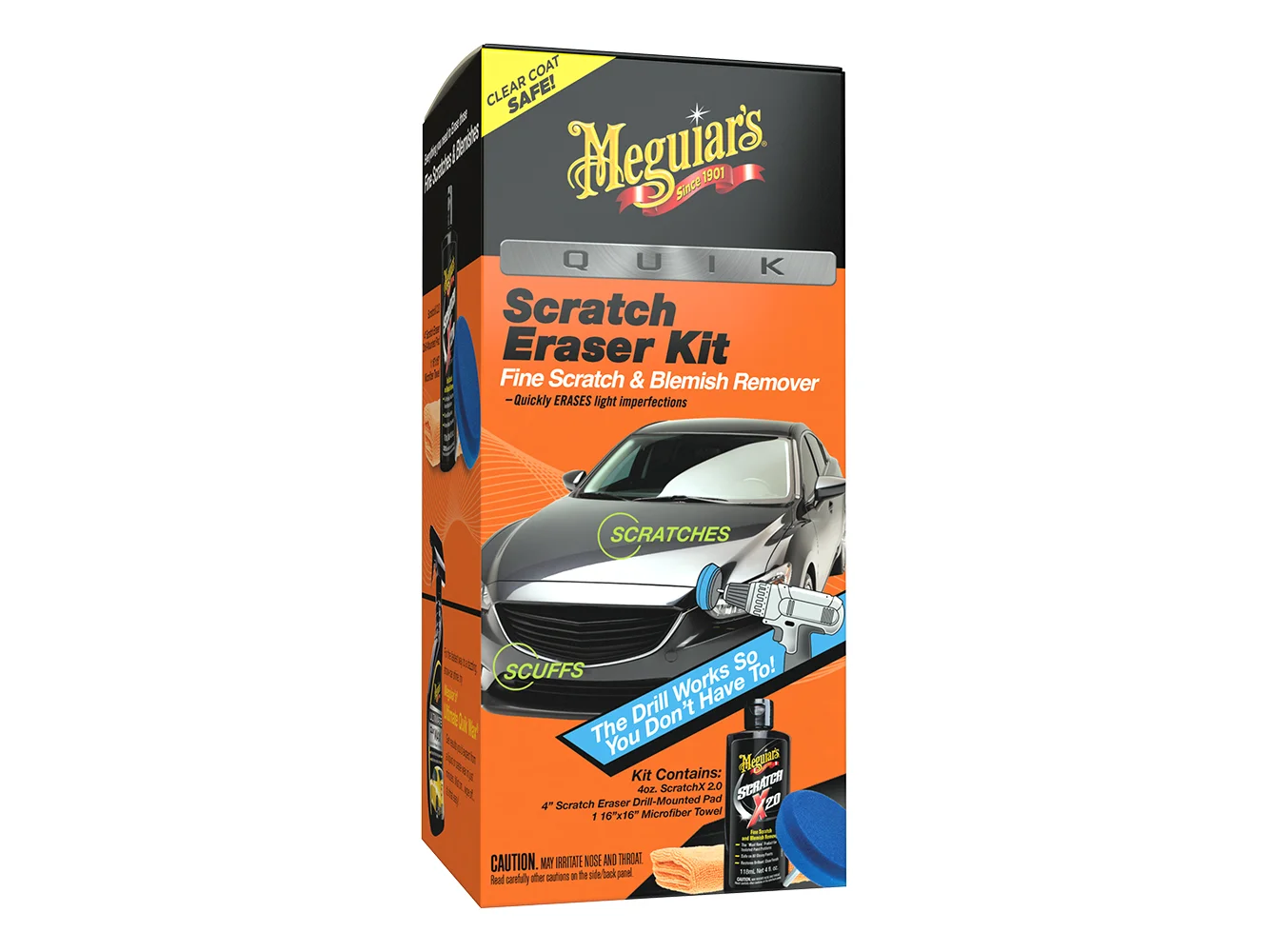 If you have light scratches and scuffs but don’t want to work by hand there’s now a great solution with Meguiar’s Quik Scratch Eraser Kit. This kit includes everything you need to remove light imperfections quickly and easily. The kit comes with Meguiar’s proprietary 4” Scratch Eraser Pad that attaches to a standard household drill greatly reducing the time and effort it takes to remove light defects when used with Meguiar’s® ScratchX® 2.0, also included in the kit. Meguiar’s ScratchX 2.0 contains microscopic abrasives to quickly and safely erase blemishes like light scratches, scuff marks, paint transfer, fingernail marks around door handles, light defects and more! The last component in the kit is a premium microfiber towel to safely and gently remove the ScratchX 2.0 and bring up a brilliant shine. So, if you have fine scratches and blemishes let the drill do the work and erase them with Meguiar’s Quik Scratch Eraser Kit!