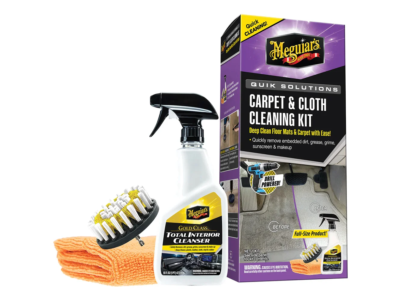 - COMPLETE CARE PACKAGE: This all-in-one kit includes Meguiar’s Total Interior Cleanser and the detailing accessories you need to use a standard drill to quickly clean and remove dirt, grease, grime, sunscreen & makeup from a variety of interior surfaces