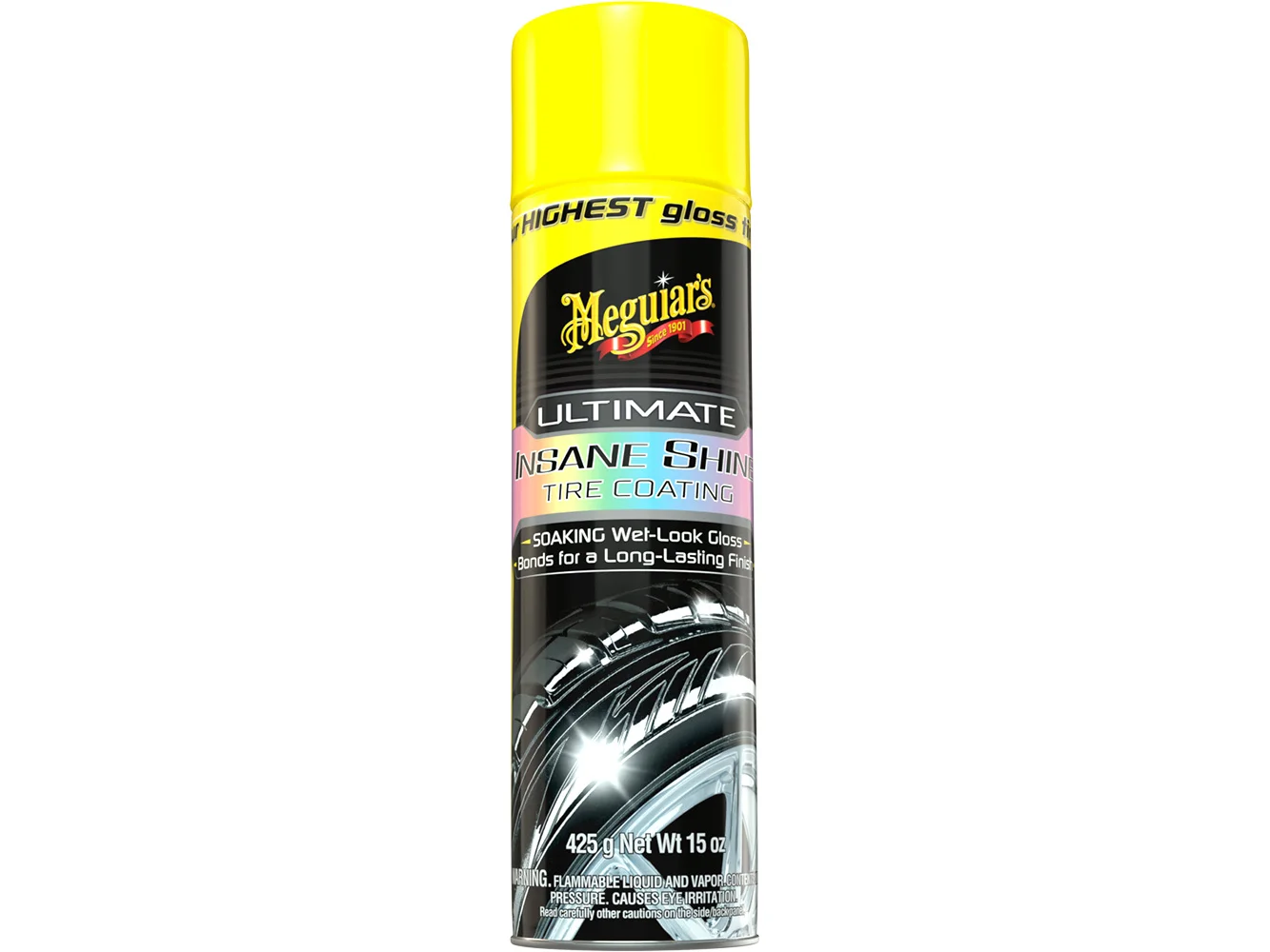 Meguiar’s Ultimate Insane Shine Tire Coating is the highest gloss tire shine Meguiar’s has to offer. With advanced synthetic polymer chemistry this premium aerosol tire shine delivers extreme, attention-grabbing depth with amazing shine and gloss. You won’t believe your eyes as tires will appear like they are actually wet! Our exclusive formula also contains enhanced resin technology producing an amazing bond for a long-lasting finish. Anti-ozonants protect tires against cracking and fading over time while the self-spreading formula is easy to work with reducing streaks and runs. So, if you are looking for a tire coating that offers protection, is easy to use and with a shine that looks like it’s soaking wet, Meguiar’s Ultimate Insane Shine Tire Coating is for you.