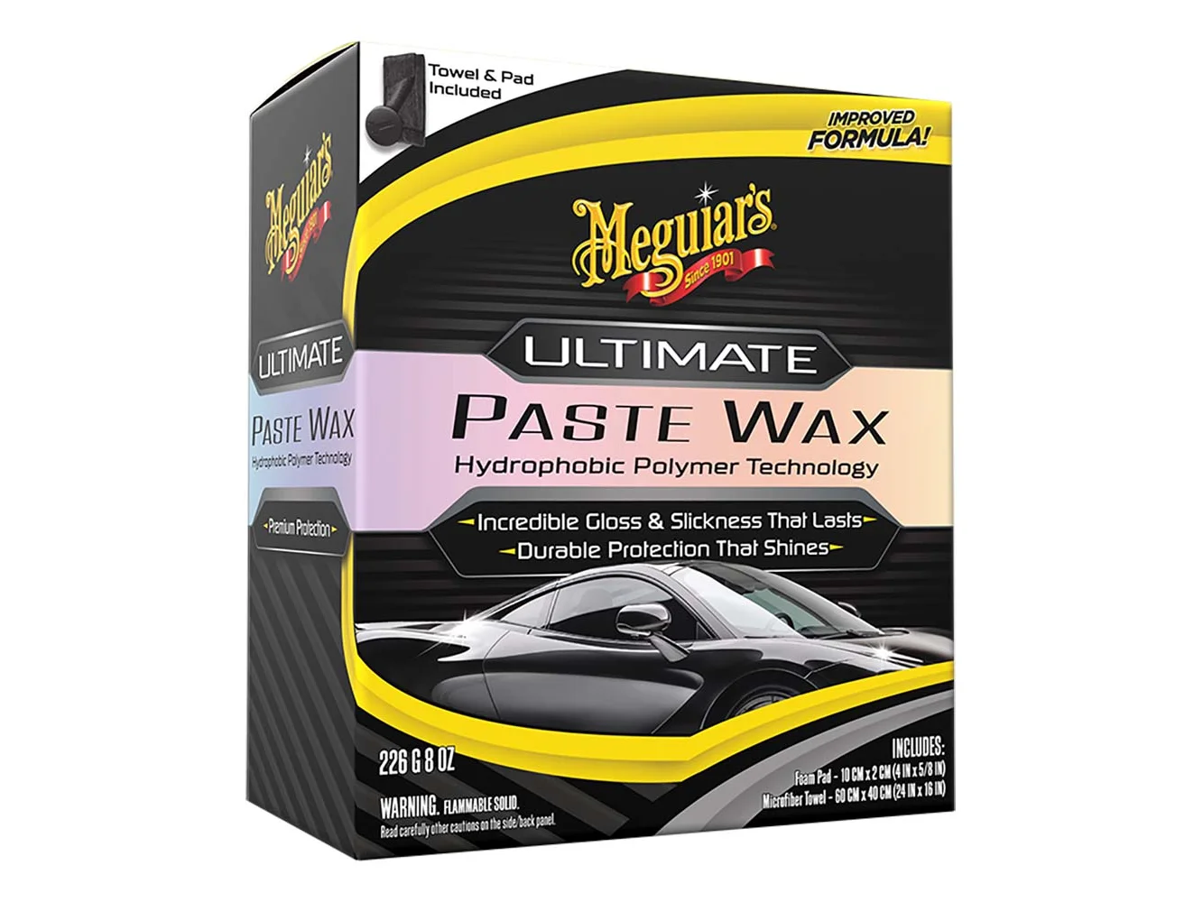 Meguiar’s Ultimate Paste Wax is a premium paint protectant with a synthetic wax blend for maximum performance. The improved formula now delivers even better durability than before. Meguiar’s proprietary Hydrophobic Polymer Technology increases surface tension for relentless water beading action that lasts. This advanced formula also delivers deep, dark reflections, incredible gloss, and shine while leaving a slick finish. This finely tuned wax was formulated to check all the boxes, without compromising ease of use. It goes on butter smooth and comes off just as nice, even in the sun! Premium foam applicator and microfiber towel included. Ultimate is also available in liquid wax.