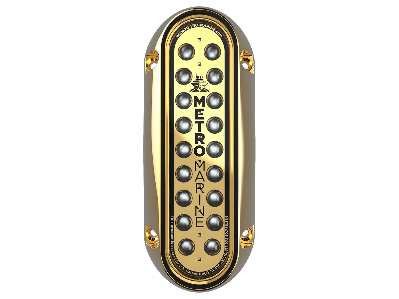 The F-Series line of underwater marine lighting fixtures is designed to mounted a depth of up to 4.6M (15′) below the water’s surface to provide vibrant Blue light in the water. With watertight aluminum bronze housings and silicon bronze hardware, Metro Marine’s F-Series luminaires are perfect for marine-based applications such as mounting to yachts, docks, sea walls, as well as for use in fountains and theme park installations. Leveraging Metro’s rich legacy of innovation and leadership in optics & LED control technology, the F-Series underwater lighting fixtures introduce a unique LED array to the market with 18 H.O. LEDs per fixture, allowing close adjacent fixture placement where fully-mixed, uniform light is important.