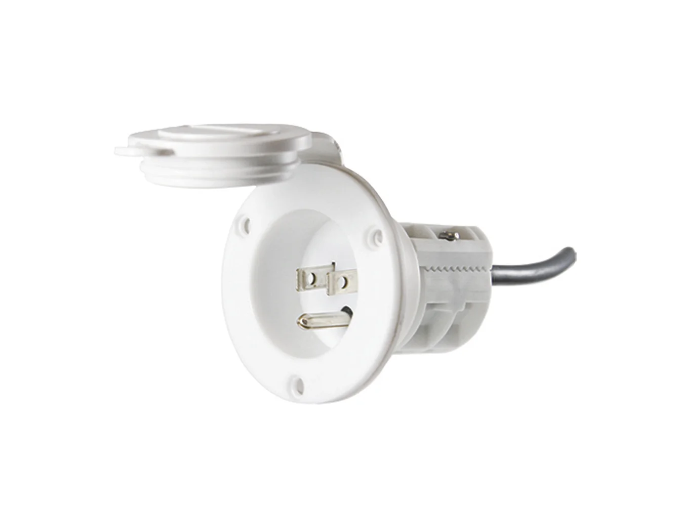 This convenient adapter allows quick thru-hull connections to an AC extension cord – with no cutting or splicing required – using the male AC plug from any of our chargers. The watertight cover and gasket prevent corrosion on the AC plug when it isn’t in use.