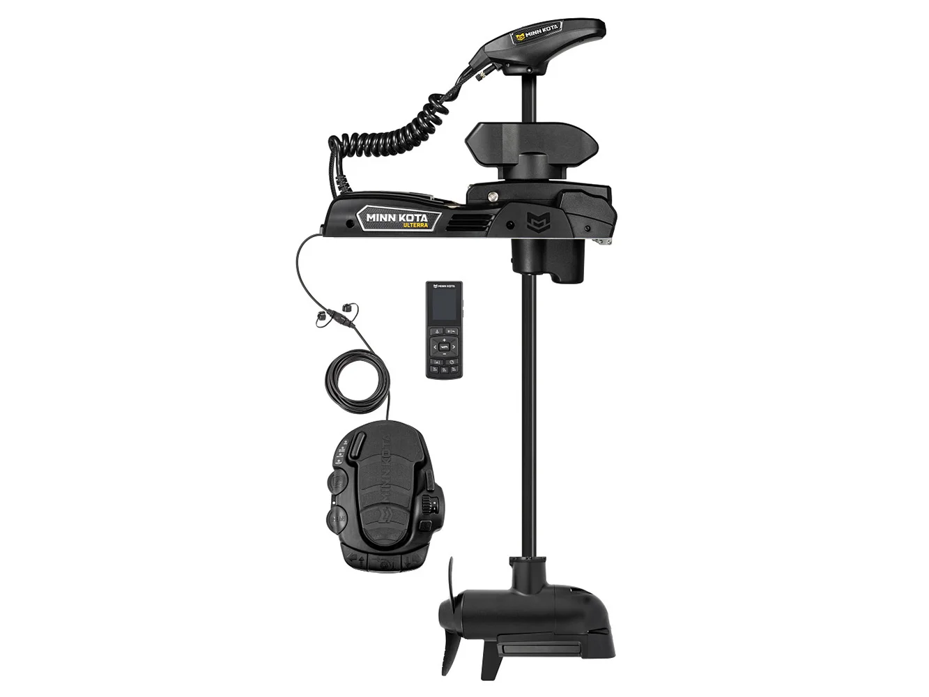 Ulterra 90/115 lb. 45″ trolling motor with Built-In MEGA Side Imaging, Wireless remote, Lanyard, Corded Foot Pedal, MKP-40 Prop, 30′ ethernet cable, Humminbird HELIX cables for Ethernet and built in sonar, and Mounting Hardware.
