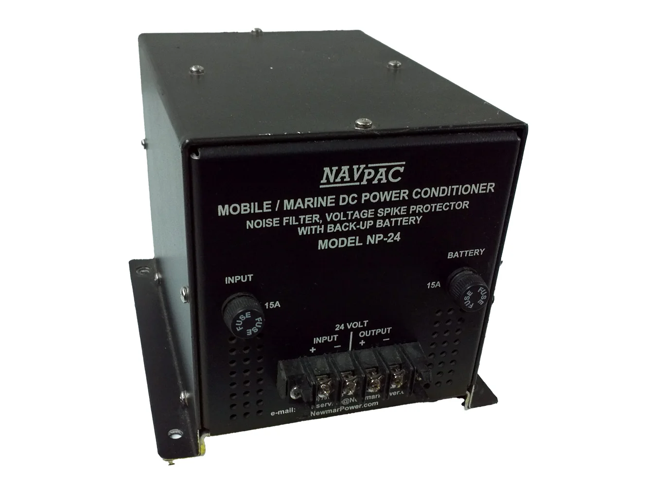 Marine communication and navigation electronics such as programmable data transceivers, GPS, and other microprocessor-controlled devices require clean and steady DC input power. Their sensitive circuitry is highly vulnerable to voltage drops from engine starts, noise and line spikes from alternators and motors, and noise from various other electronic devices. NAV-PAC prevents these conditions from affecting electronics.
