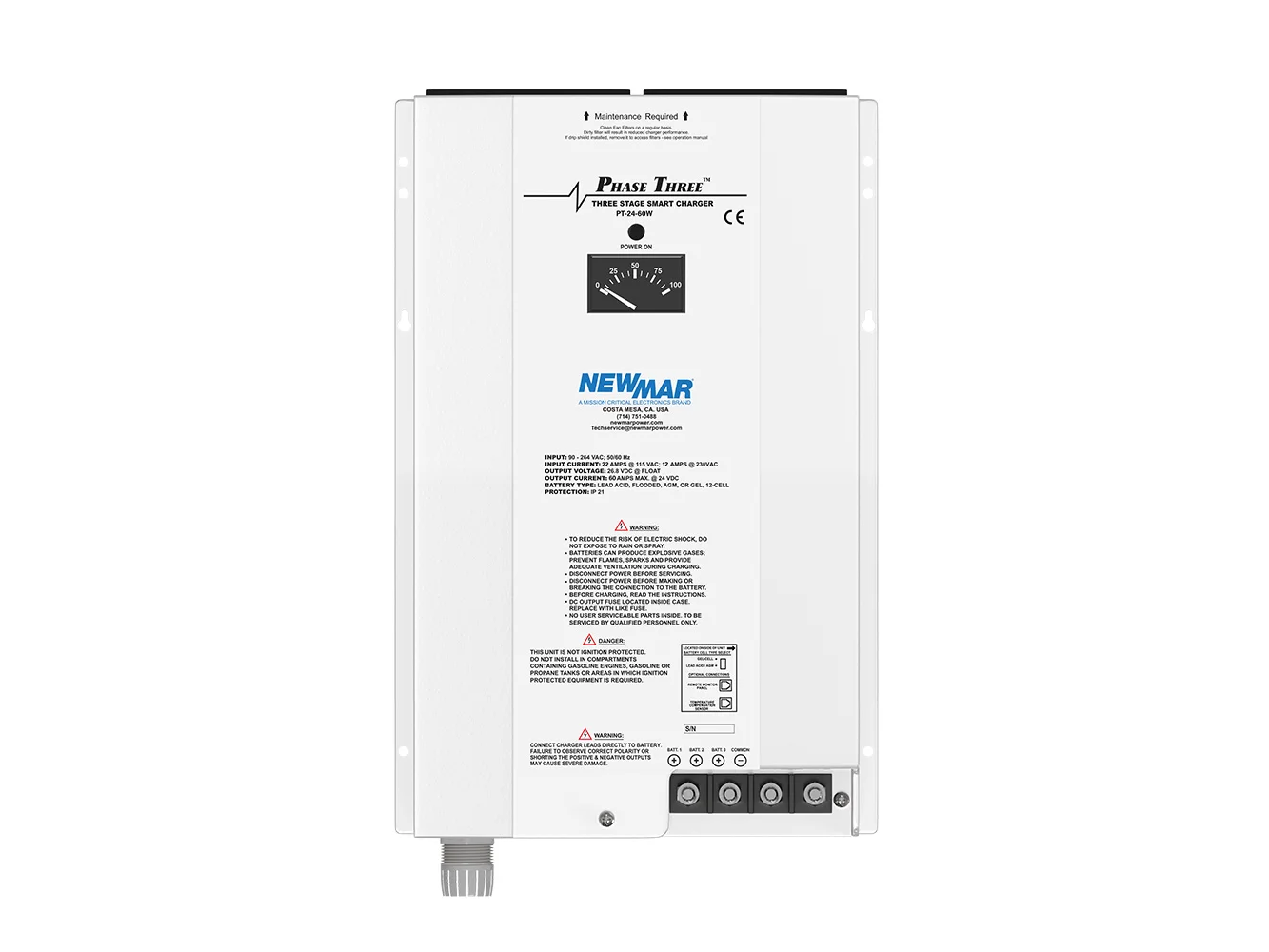 “Smart” marine battery charging technology for 24V systems aboard workboats, military vessels, commercial vessels, and recreational craft. This charger interacts with batteries, providing the optimum three-stage charge process for fast recovery and conditioning, maximizing performance, and extending battery life.