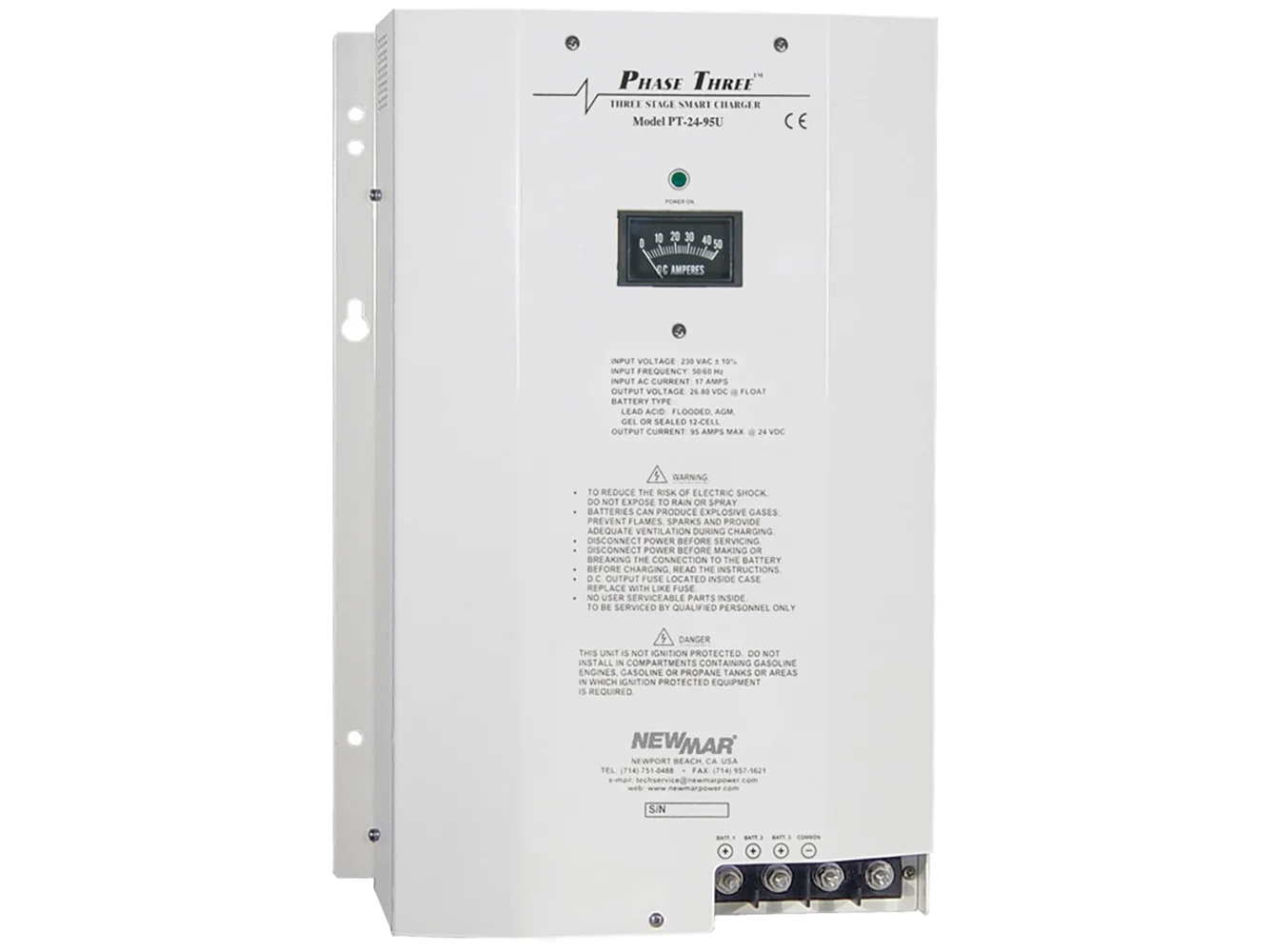 “Smart” marine battery charging technology for 24-volt systems aboard workboats, military vessels, commercial vessels, and recreational craft. This charger interacts with batteries, providing the optimum three-stage charge process for fast recovery and conditioning, maximizing performance, and extending battery life.
