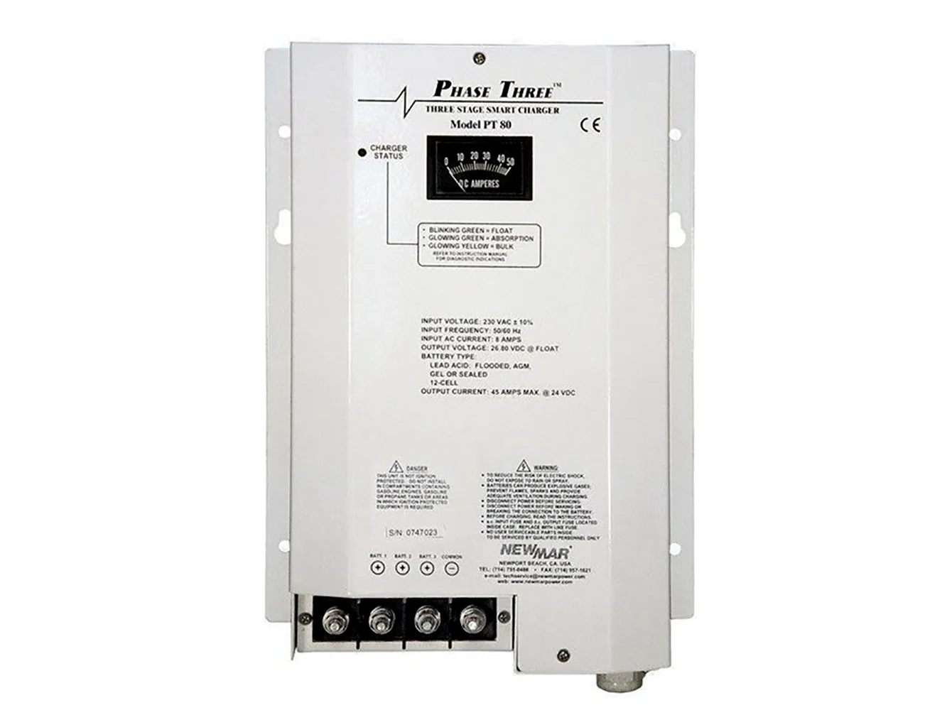 Newmar’s Phase Three Series Battery Chargers employ “Smart” battery charging technology for 12-volt systems aboard marine applications including workboats, military vessels, commercial vessels, and recreational craft. This charger interacts with batteries, providing the optimum three-stage charge process for fast recovery and conditioning, maximizing performance, and extending battery life.
