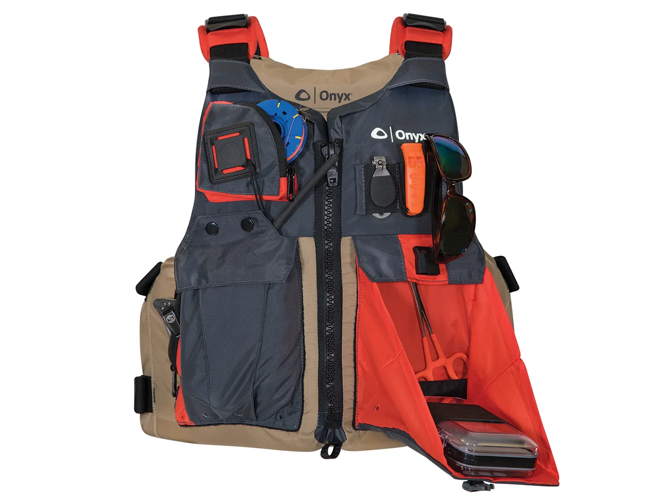 The Onyx Kayak Fishing Vest comes equipped with zippered fleece-lined pockets to hold all of your essential fishing gear.