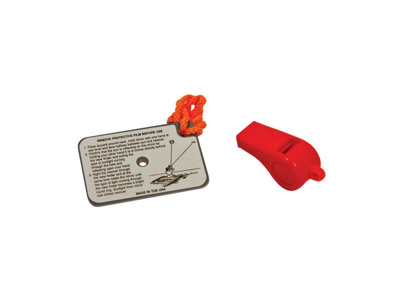 Audible and visual signal for dry areas. Help rescuers note there is an emergency and guides them to your location. Audible signal will not freeze. Mirror (2 x 3) with lanyard and view finder. Made of plastic for durability. Help rescuers know there is an emergency and guide them to your location. Weighs only 2 ounces.
