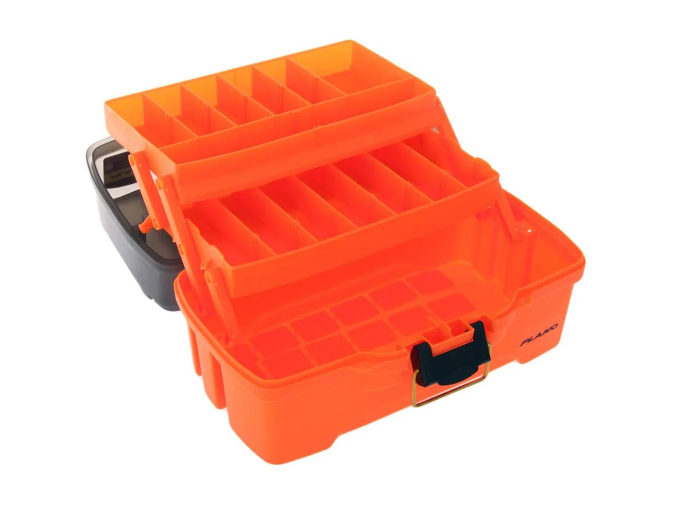The next size larger is the bright orange Two-Tray Tackle Box, which is 14.25 inches long, 8.5 inches wide and 7.75 inches high. The Two-Tray Tackle Box features a two-tier cantilever tray that extends when the box is opened. The trays feature 14 to 25 adjustable compartments. It has top-access storage as well as bulk storage for larger items in the bottom.