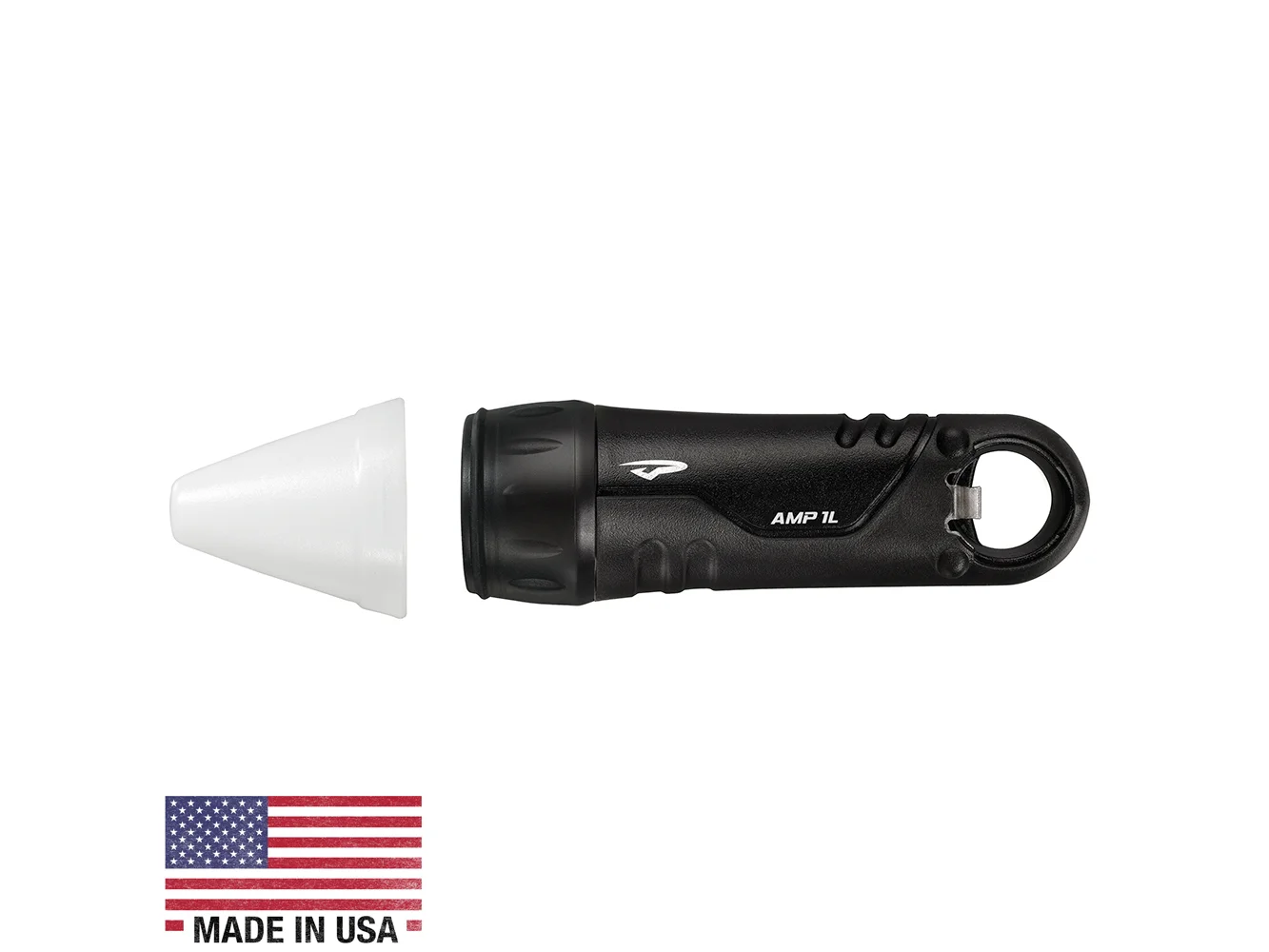 Waterproof to 100M (330ft) and equipped with a large carabiner loop, this handheld light is ready for any conditions and easy to clip onto gear. The Amp 1L comes with a snap on translucent cone to turn it into a marker light, hanging lantern or area light.