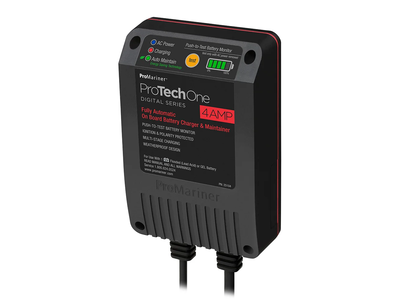 ProMariner’s ProTechOne Fully Automatic Onboard Battery Charger and Maintainer utilizes the latest in microprocessor and software control charging and energy-saving auto maintain technology. Safe for short and long-term storage with multi-stage charging, conditioning, and auto maintaining proved to maximize battery performance and life. Designed for weatherproof applications and years of trouble-free use, ProTechOne boasts a gasket molded case design for outdoor use with commercial-grade jacketed AC and DC cables for maximum cable protection and durability.