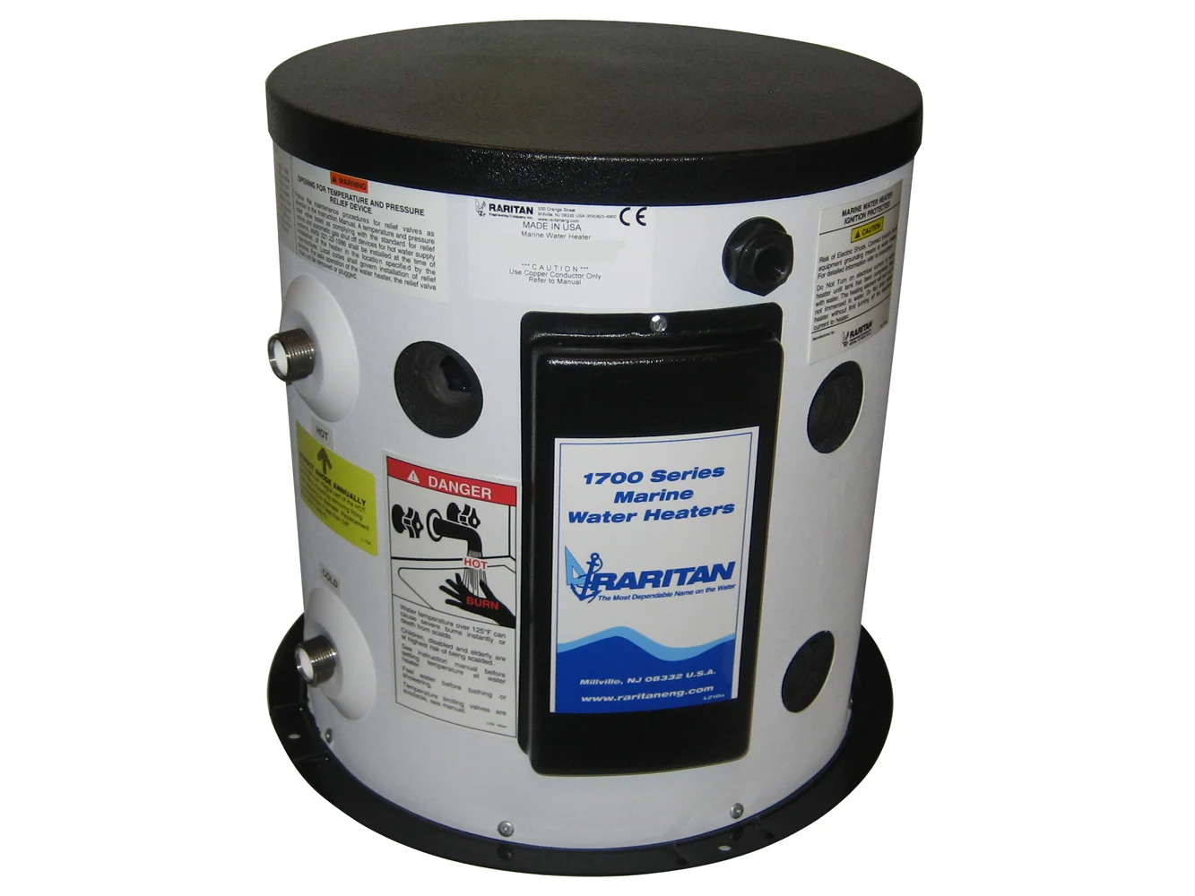 Raritan’s water heaters use an ignition protected thermostat. Although it is factory set to 120°F, it is adjustable from 110° to 160°F and has a safety shut down limit of 190°F. All models and sizes have the plumbing connections on the same side to simplify installation. Hot and cold water connections are 3/4″ male NPT (National Pipe Thread). Heat exchanger connections are 3/4″ female NPT.