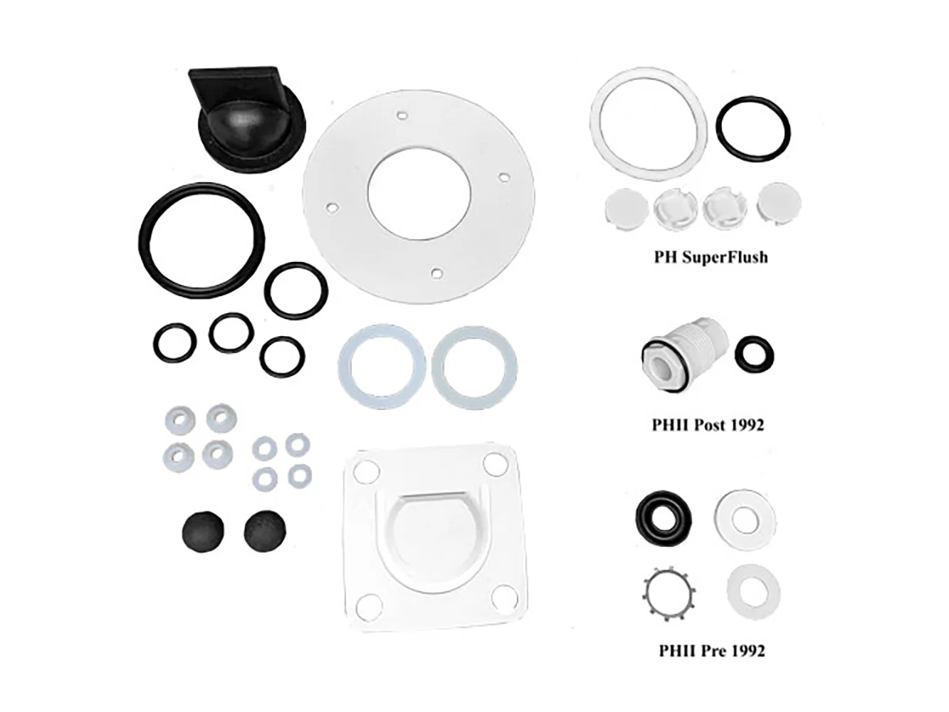 These universal repair kits service all PH/PHII Raritan heads manufactured between 1960 and the present. It replaces kits PHRK, PHRKII, and PHRKIIC.
