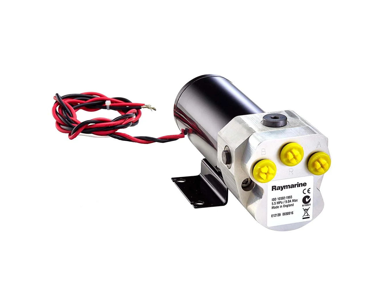 Raymarine Evolution pilots connect to hydraulic steering systems using a rugged hydraulic pump matched to the capacity of the hydraulic steering system.