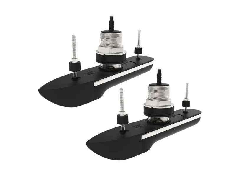 The RVM-420 transducer pairs feature titled offset sonar elements inside their surface mount housings. The tilted elements ensure the sonar’s beam patterns are correctly aligned for maximum performance while eliminating the drag and turbulence associated with a fairing-blocked transducer installation. Bundled transducer pairs include a Y-Cable harness that internally joins the two transducers together and an 8-meter transducer extension cable.