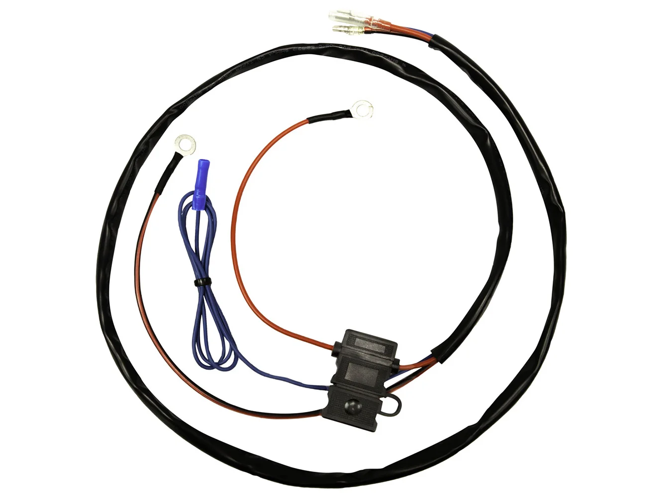 It features battery terminals on one end and bullet connectors on the other to connect the light to the custom 3 position switch. Also included is a blue wire with an insulated butt connector to power the light and switch and an in-line 15A fuse holder.