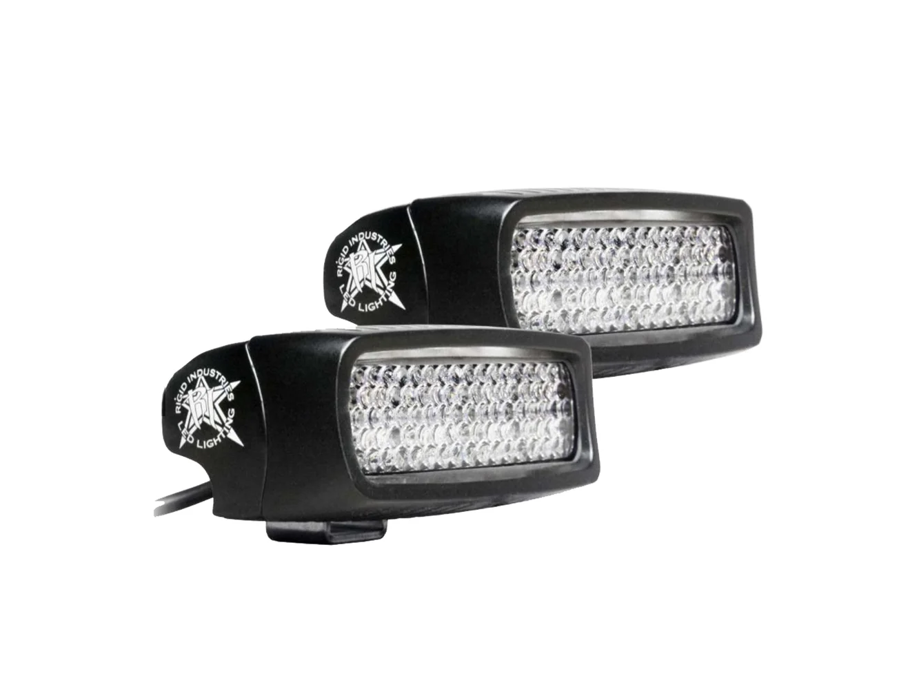 This lighting kit includes everything you need to install a pair of RIGID Industries back-up lights on your vehicle: Two LED lights, and extended 25′ wiring harness hardware and black covers. This kit features our patented Hybrid optics system combined with a Diffused lens, to offer a powerful 60deg beam pattern for unmatched visibility.