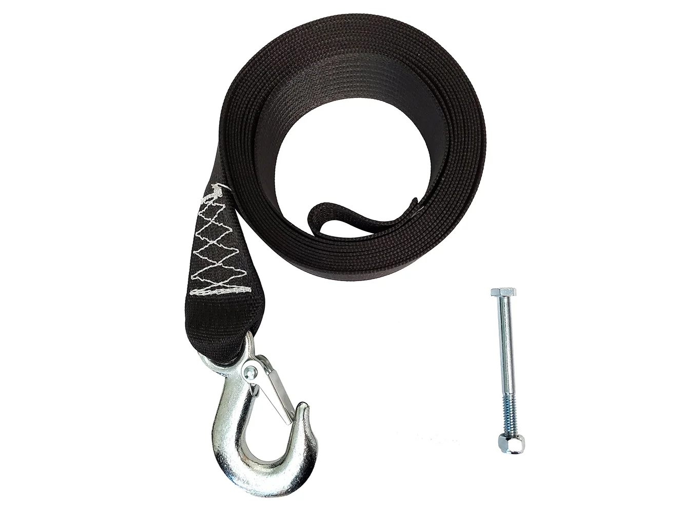 A 12′ Replacement winch strap constructed of 7,000 lb. polyester belt and drop forged steel safety snap hook. Includes a bolt and nylon lock nut for drum installation.