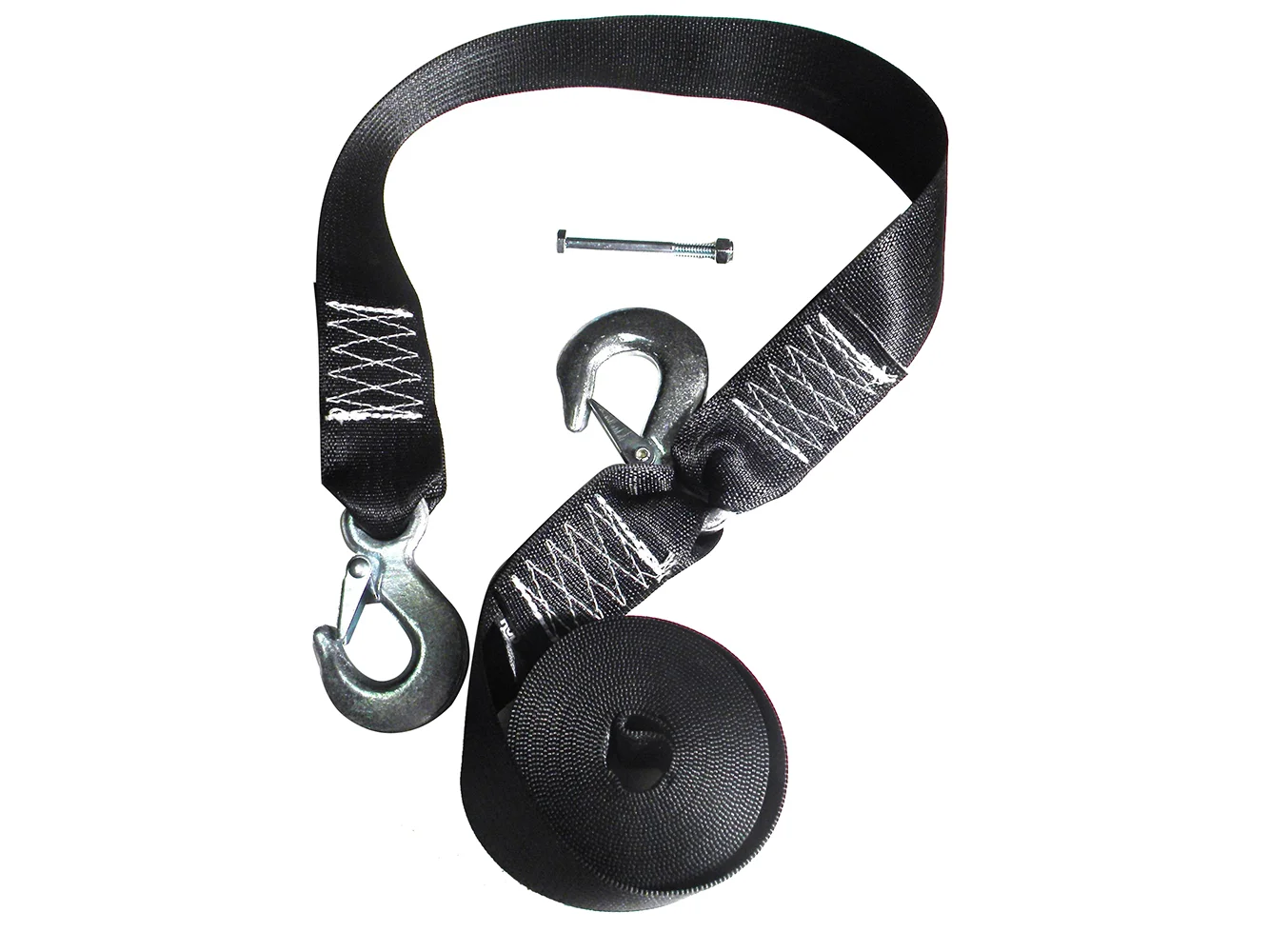 20′ Replacement winch strap with 30″ safety strap and 3,970 lb. drop forged snap hook. The winch strap is constructed of 7,000 lb. polyester belt and 6,600 lb. drop forged snap hook. Includes a bolt and nylon lock nut for drum installation.