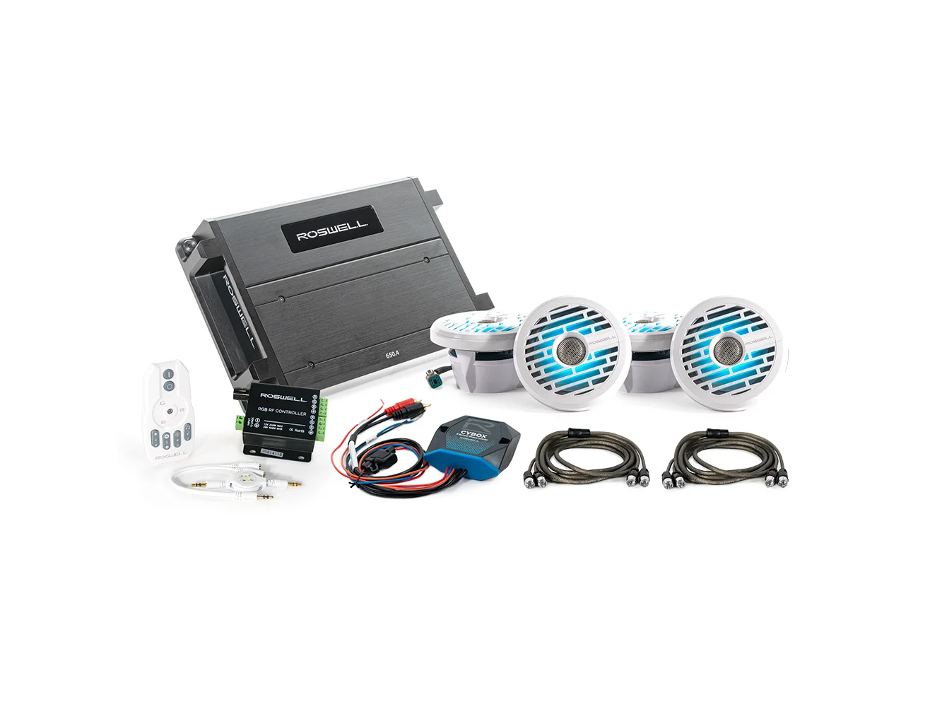 If you’re searching for an all-in-one premium sound solution, the Roswell R1 Marine Audio Package has you covered. Everything boaters need to experience the world-renowned Roswell sound is included, featuring four R1 6.5″ Marine Speakers along with their R1 650.4 amp, Cybox Bluetooth Controller, RGB Controller, RCA Cables, and Dual Zone Controller.