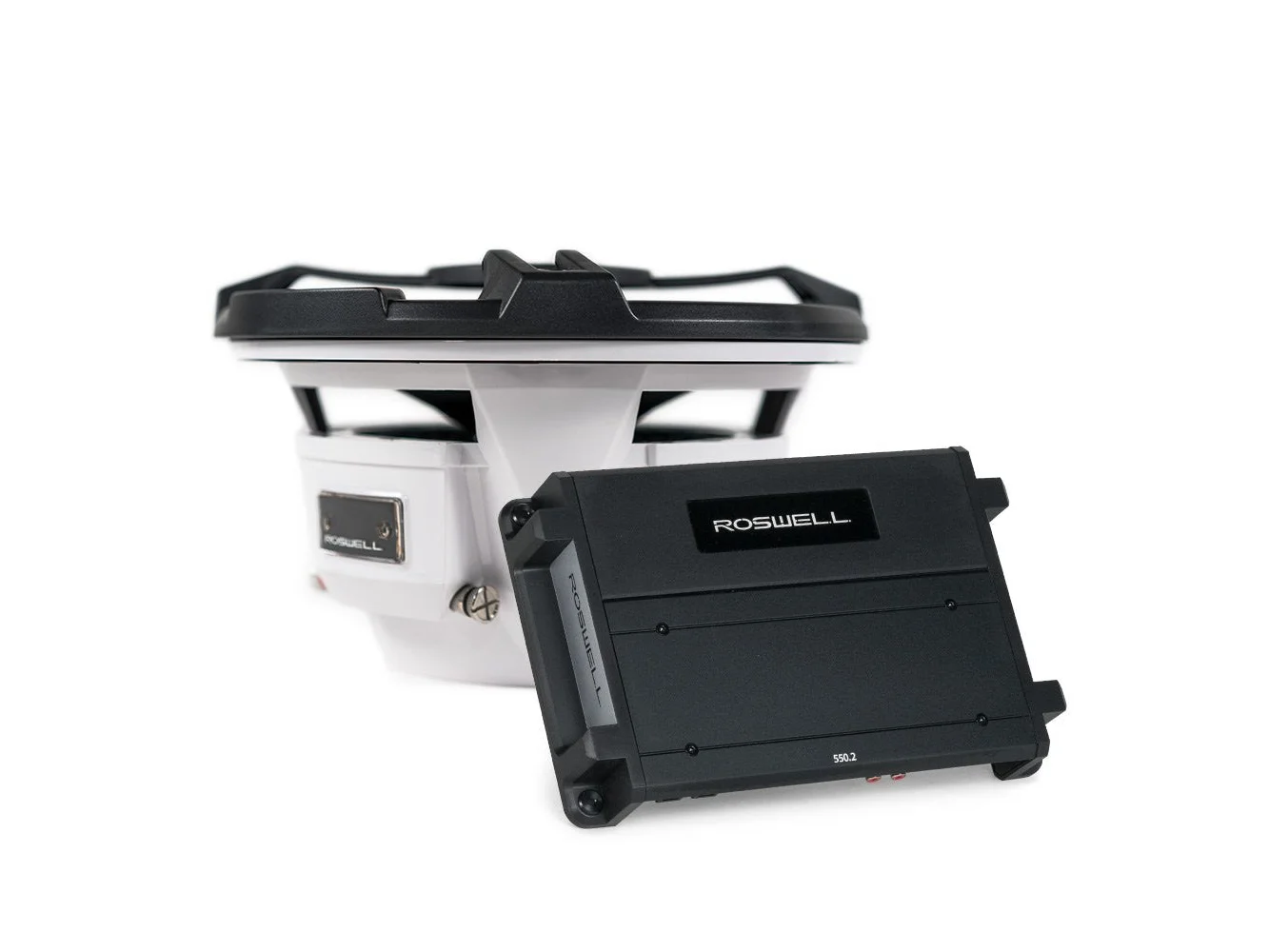 Roswell’s R1 550.2 is the ideal amp to run an R1 tower speaker setup. It’s a 2-channel Class-D design that puts out 165 watts RMS per channel at 4Ω and 275 watts RMS per channel at 2Ω. It features calibrated crossover controls, differential RCA inputs for maximum noise rejection, fully conformal-coated PCBs, and nickel-plated marine-grade wire terminals.