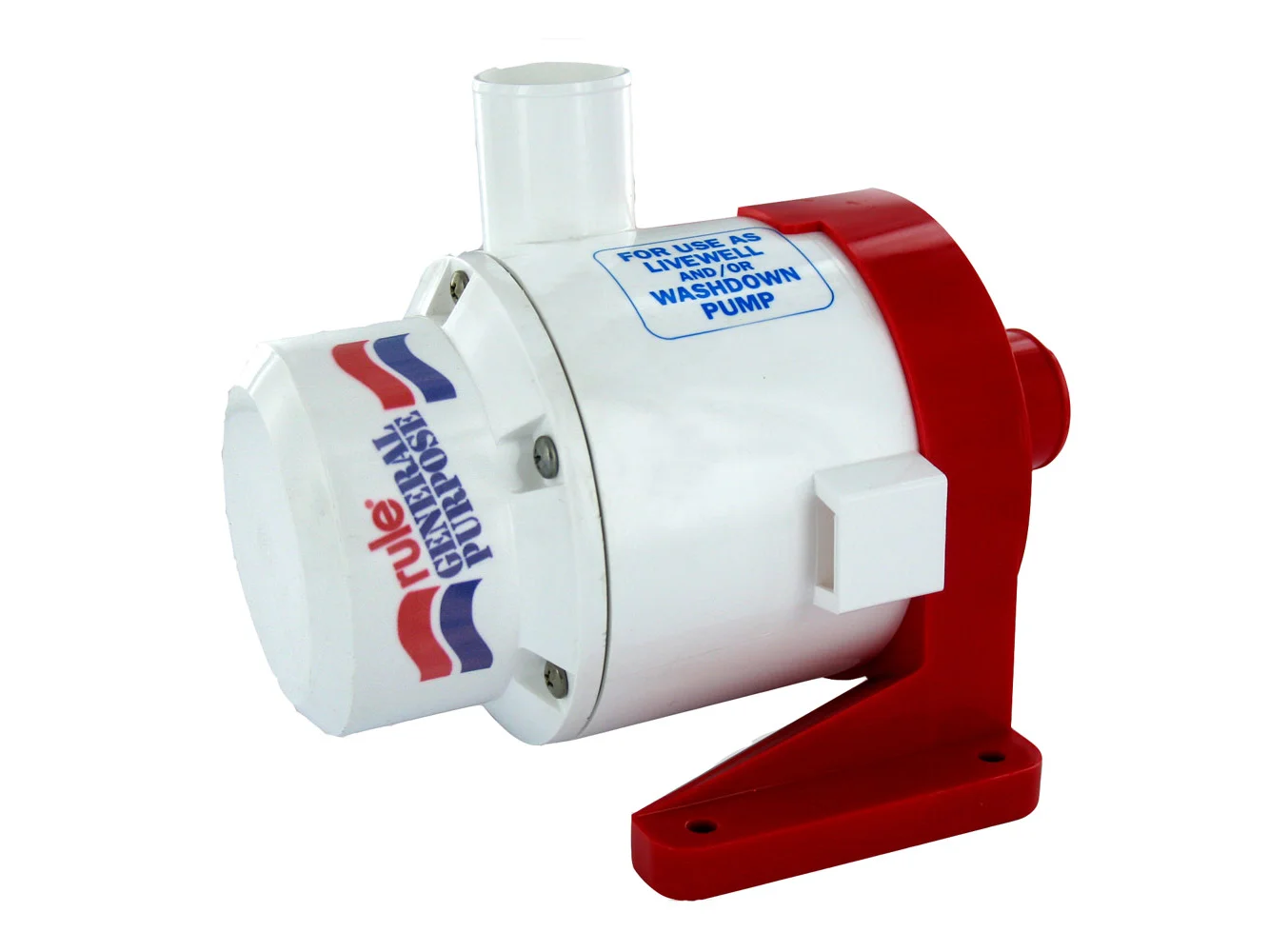 The Rule General Purpose Pump is designed for use as a washdown pump and/or to circulate water to your livewell tank(s). Heavy duty construction for use on commercial or pleasure boats. 1-1/2″ (38mm) inlet and 1-1/2″ (38mm) discharge outlet. The Rule General Purpose Pump must be mounted below the waterline. It does not deliver high pressure, nor is it self priming. It delivers lots of water but at low pressure. 12 volts DC unless noted.