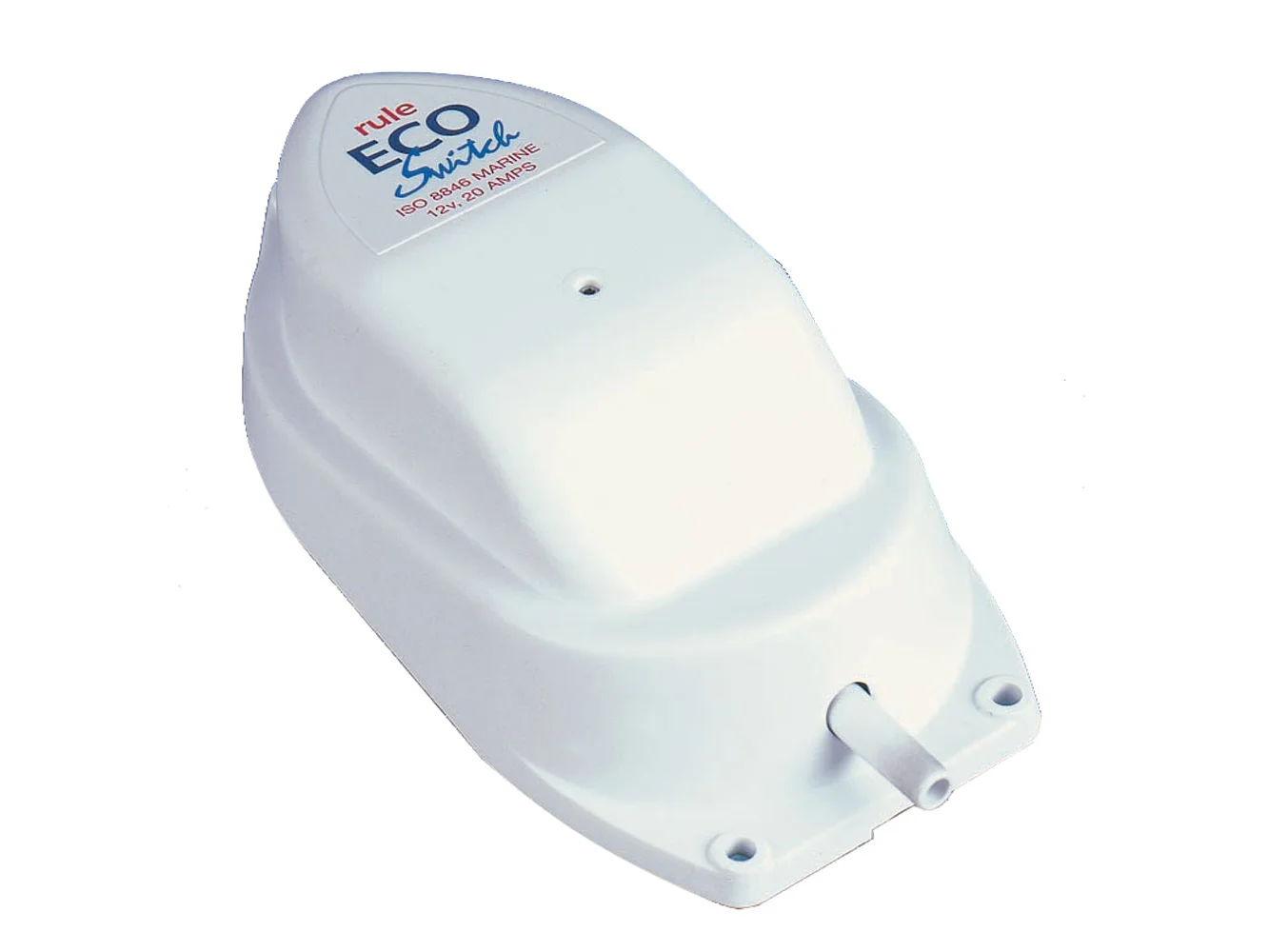 The Rule ECO-Switch is an ecologically sound automatic bilge pump control control switch. Featuring a non-mercury design, the pump operates with simple air pressure. As water rises in the bilge, air rises in the air tube that is attached to switch. This air pressure activates the switch which controls your pump. There are no moving internal parts, all wiring is out of the water, and there are no submerged electrical connections at all. Offering complete reliability and outstanding performance, the Rule ECO-Switch offers a viable alternative to traditional float switches.