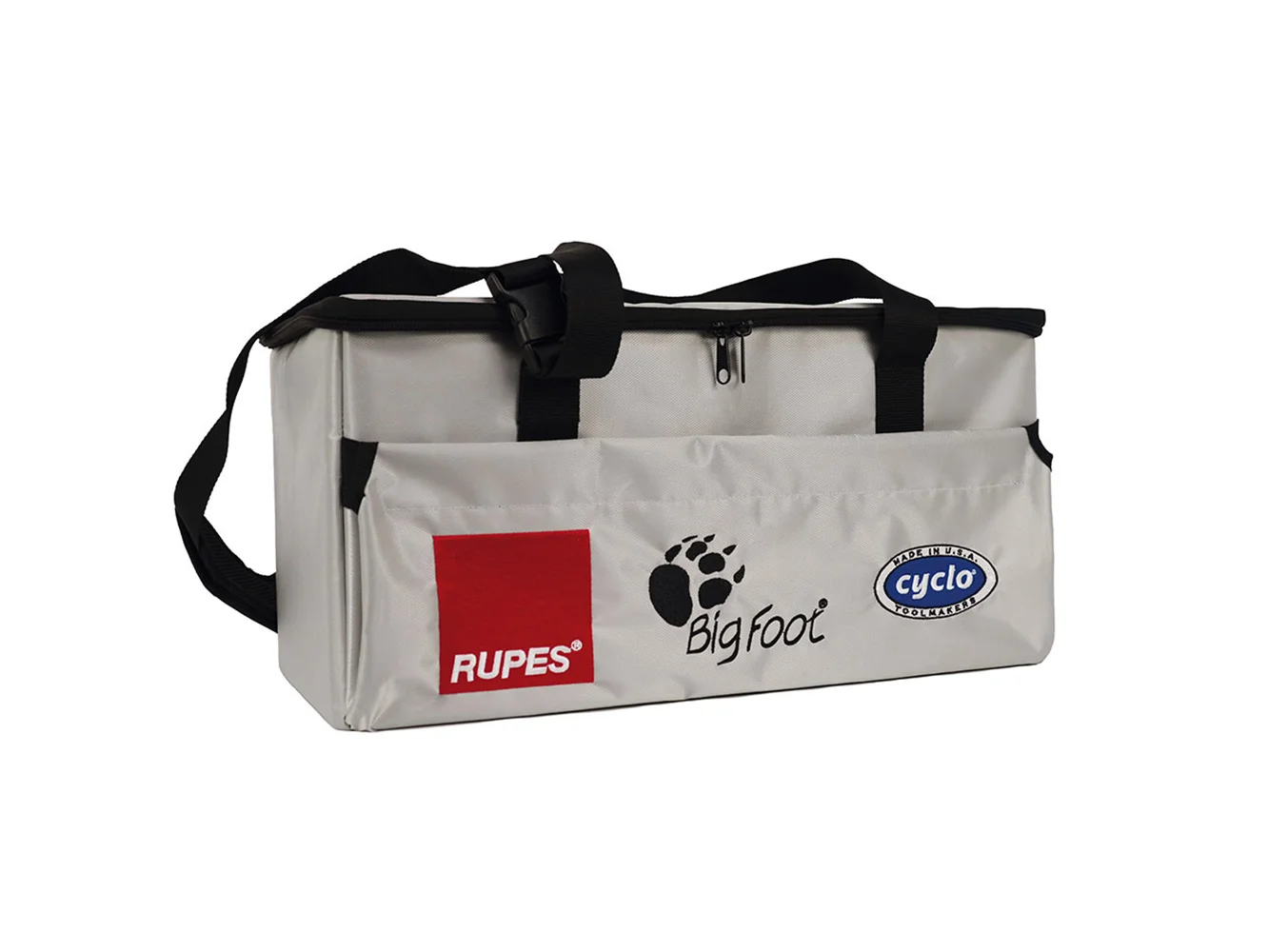 A durable, foldable, rectangular carrying bag with the RUPES logo prominently displayed on the side, along with the BigFoot logo. The bag is made from a robust, silver-gray fabric, designed for carrying tools, consumables, and accessories. It features a black, adjustable shoulder strap along with two short handles for versatile carrying options. The top of the bag has a zippered closure, providing easy access to the main compartment and to the other internal pockets.
