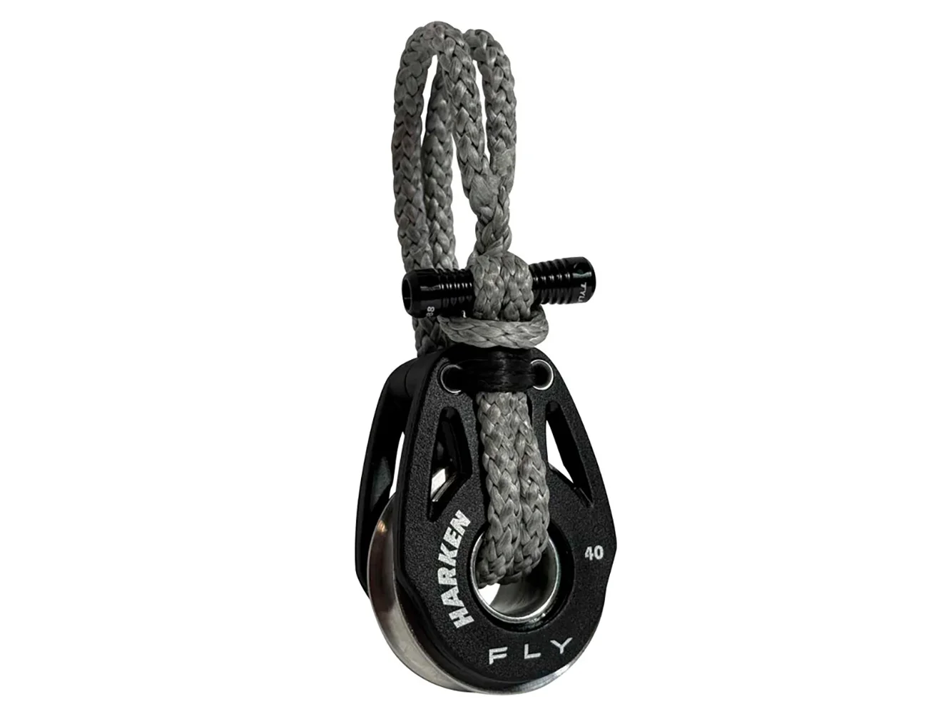 This harken block features a titanium outer race and sheave, stainless steel ball bearings, and an inner race, along with composite fiber-reinforced side plates. The block measures 40 mm, making it compact yet powerful for a range of fishing applications. It's specifically engineered for advanced rigging setups, providing seamless compatibility with high-tech lines.