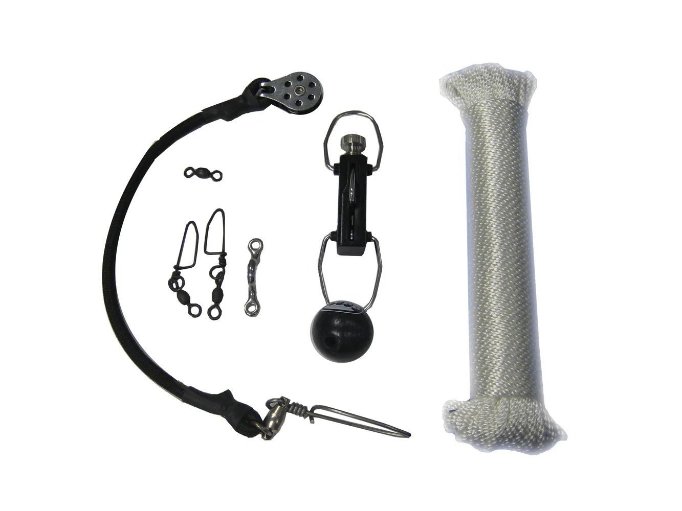Complete rigging packages that allow you to run One (1) lines on each rigger. this kit includes (1) exclusive Rupp single pulley shock cord, 45ft of white nylon, (1) Rupp KLICKER release clip. (1) Nylon ball stop, (1) Strap Eyes, (2) Heavy Snap Swivels, (2) Crimps-Nickel.