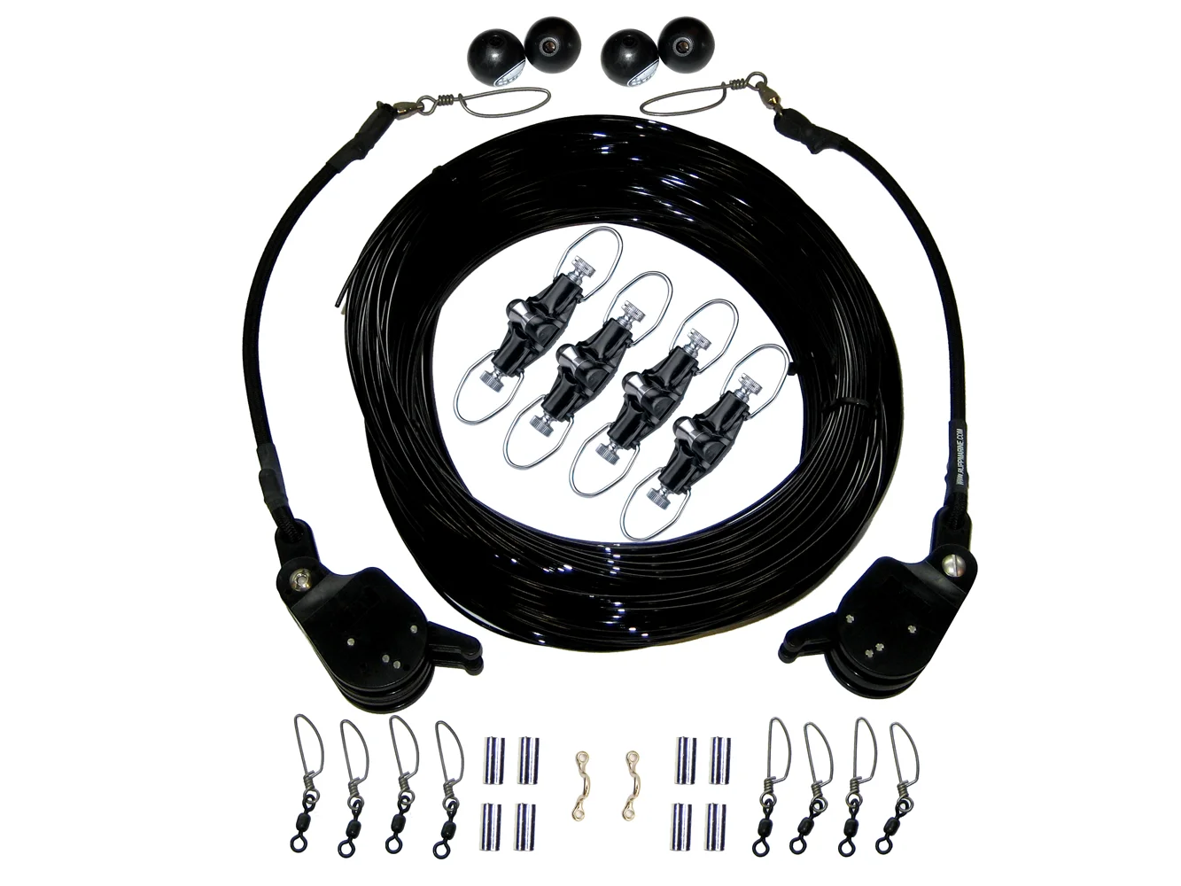 Complete rigging packages that allow you to run two (2) lines on each rigger. This kit includes (2) exclusive Rupp double pulley halyard line locks with shock cords, 260ft of 400lb black mono-filament halyard lines, two pair of Rupp NOK-OUT release clips, (4) Nylon ball stops, (2) Strap Eyes, (8) Snap Swivels, (8) Crimp Sleeves.