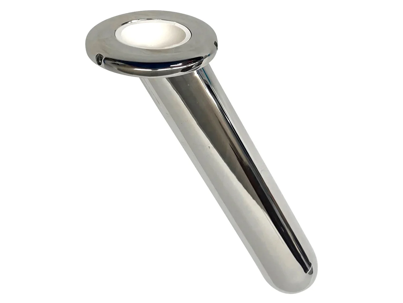 2020 IBEX Innovation Award Winner. This patent-pending rod holder is a game changer! Manufactured from investment cast stainless steel the innovative design combines the easy installation of a standard rod holder with the sleek look of a bolt-less rod holder. No special tools or fasteners are required. This rod holder features a removable and replaceable top flange for easy customization, replacement, or re-polishing. Closed-end with threaded drain hole. This is the last rod holder you will need on your boat…ever!