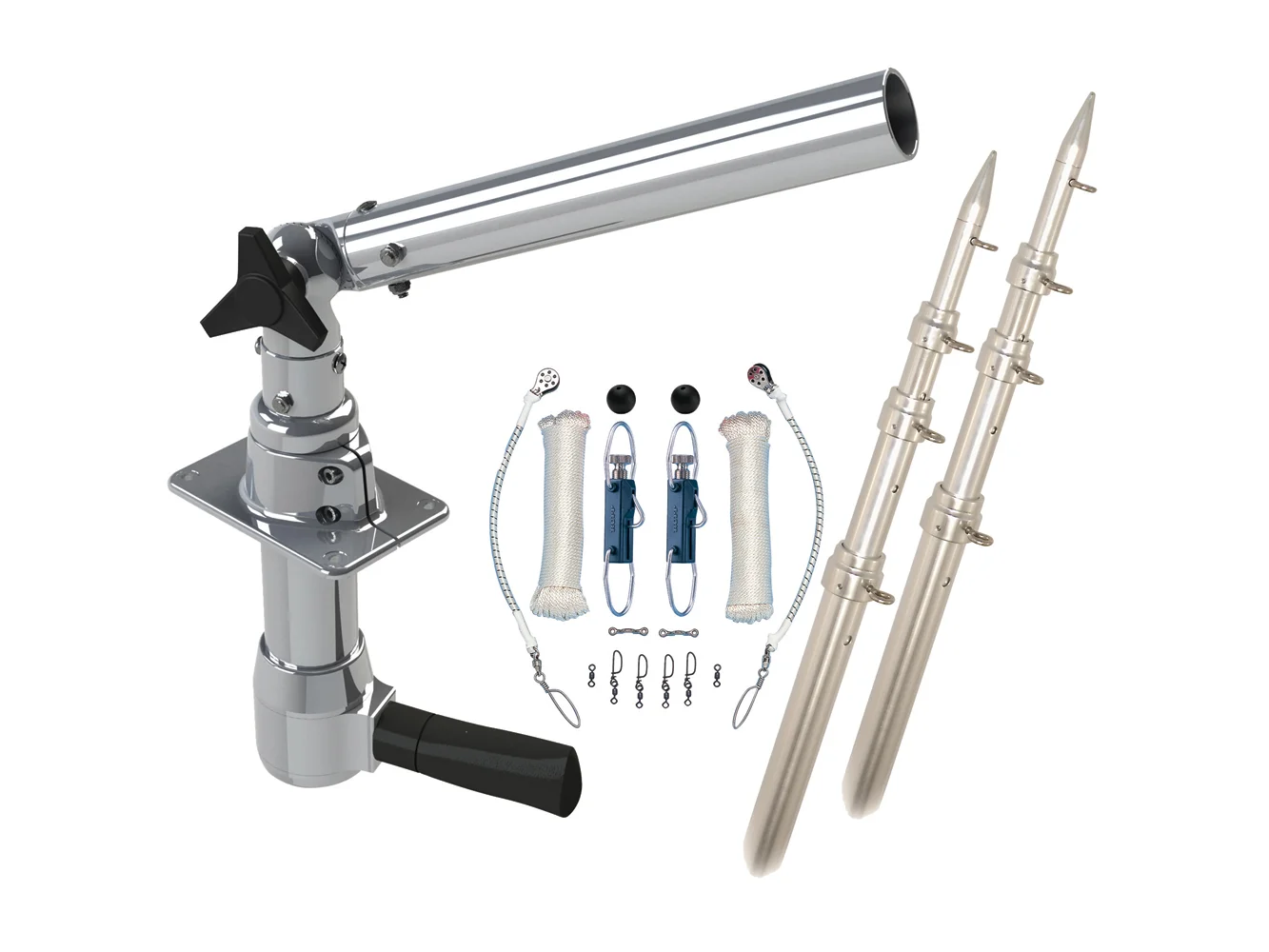 This package comes complete with a pair of Revolution Bolt-In Top Gun Radial bases, a pair of 18′ Telescoping poles and a complete single line rigging kit with Rupp release clips.