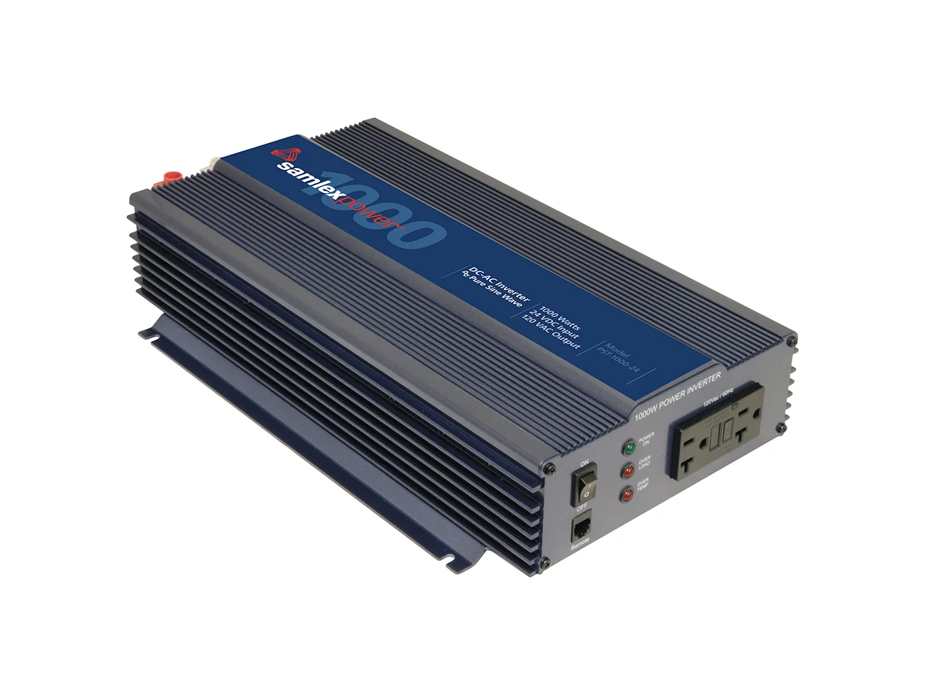 This high efficiency DC-AC inverter converts 24 Volts DC to 1000 Watts of pure sine-wave AC power at 120 Volts, 60 Hz. The unit comes with pin-type battery cable lugs. Features include overload protection, low battery alarm / shut down, low idle power draw of less than 0.85 Amps. AC power is available from a NEMA-20R GFCI duplex outlet on the front panel. Safety certified to UL standards.