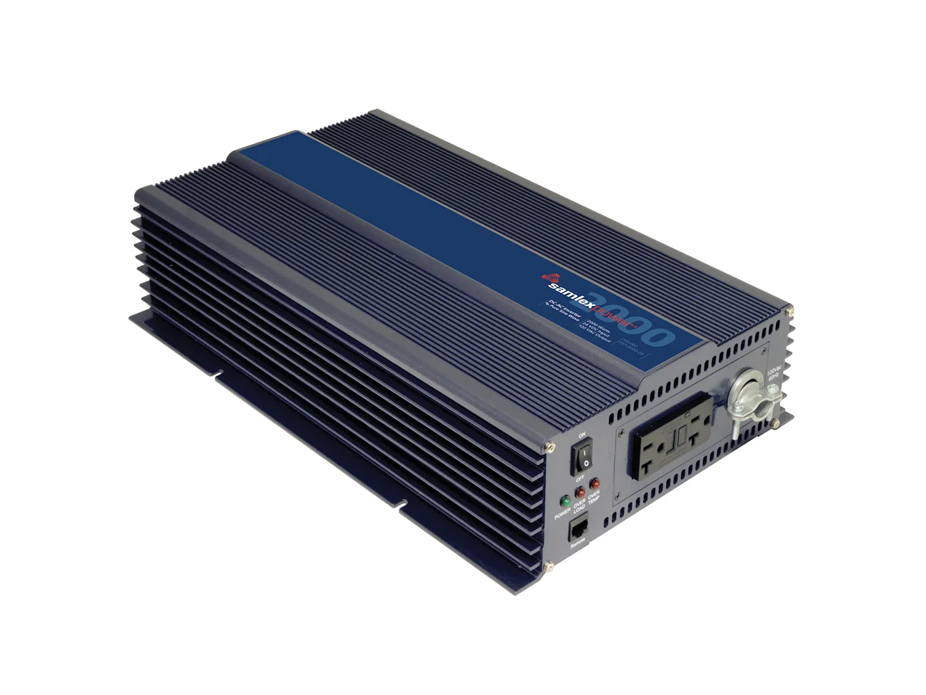 This high efficiency DC-AC inverter converts 24 Volts DC to 2000 Watts of pure sine-wave AC power at 120 Volts, 60 Hz. The unit comes with pin-type battery cable lugs. Features include overload protection, low battery alarm / shut down, low idle power draw of less than 1 Amp. AC power is available from a NEMA-20R GFCI duplex outlet on the front panel. Safety certified to UL standards.