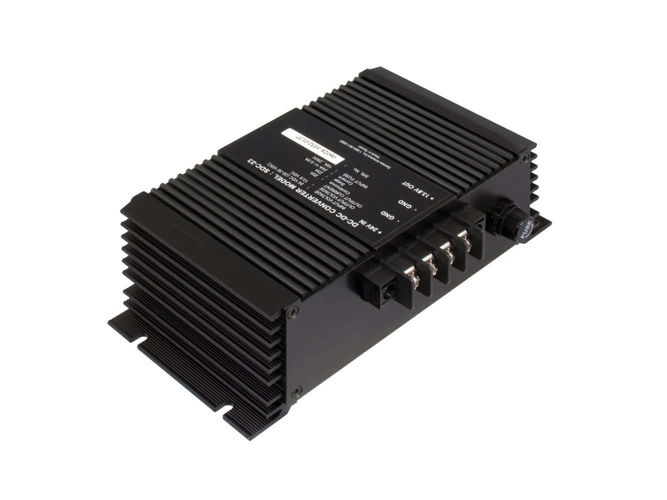 This high efficiency switch-mode step-down DC-DC converter converts an input voltage of 24 VDC nominal (range 20 VDC to 35 VDC) to a highly regulated output voltage of 12 VDC nominal (13.8 VDC) at 20 Amps. The SDC-23 DC-DC converter is non-isolated (no galvanic isolation between input and output) and meant for use in negative ground systems. Features include overvoltage/short-circuit protection, temperature compensated current limit, output-side overvoltage protection, input-side overvoltage/ transient protection and input-side reverse polarity protection. The SDC-23 DC-DC converter is designed for heavy duty applications.