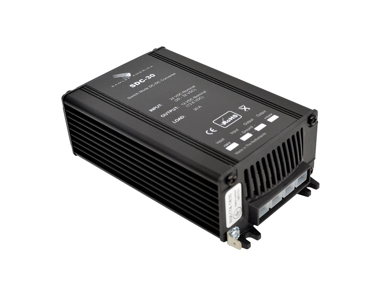 This high efficiency switch-mode step-down DC-DC converter converts an input voltage of 24 VDC nominal (range 20 VDC to 32 VDC) to a highly regulated output voltage of 12 VDC nominal (13.8 VDC) at 30 Amps. The SDC-30 DC-DC converter is non-isolated (no galvanic isolation between input and output) and meant for use in negative ground systems. Features include overload, over-heating, reverse polarity and over-voltage protection.