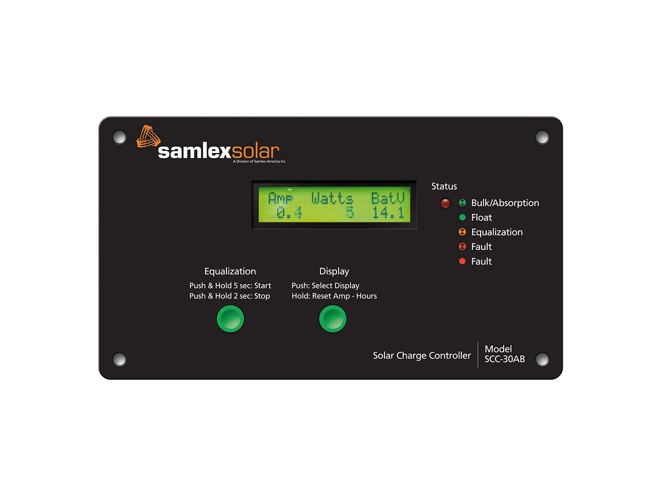 The Samlex 30 Amp Charge Controller regulates current and protects your batteries from over-charging. Features of this 4-stage Charger include: LED status indicators, digital LCD monitor and 8 charge settings for most battery types. Charging is further regulated with the optional DC-BTS-A-C Battery Temperature Sensor.