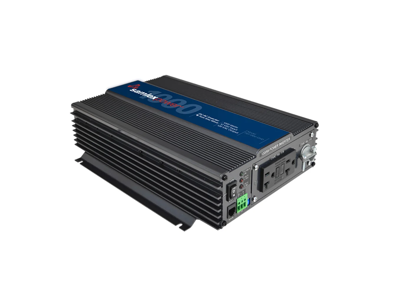 PST-1000-12HD is a pure sine inverter and features a hardwire connection for flexibility in installation, selectable low voltage shutdown (battery protection), and a low voltage alarm and alarm buzzer disable switch. PST-1000-12HD is user-friendly, easy to install, and has a small footprint. AC power is available from a NEMA-20R GFCI duplex outlet on the front panel. Safety certified to UL standards.