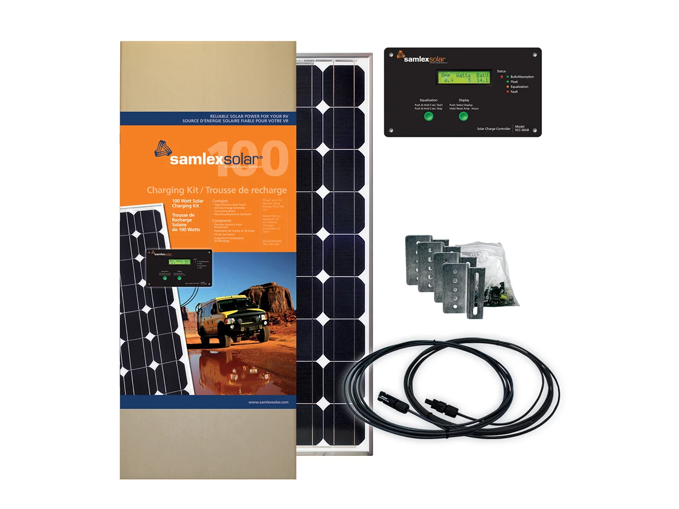 The Samlex SRV-100-30A Solar Charging Kit comes with a high efficiency 100 Watt solar panel, a 30 Amp charge controller, connecting wires and aluminum mounting brackets and hardware that can be used to secure the solar panel to the roof of your remote structure or vehicle, or any other flat surface.