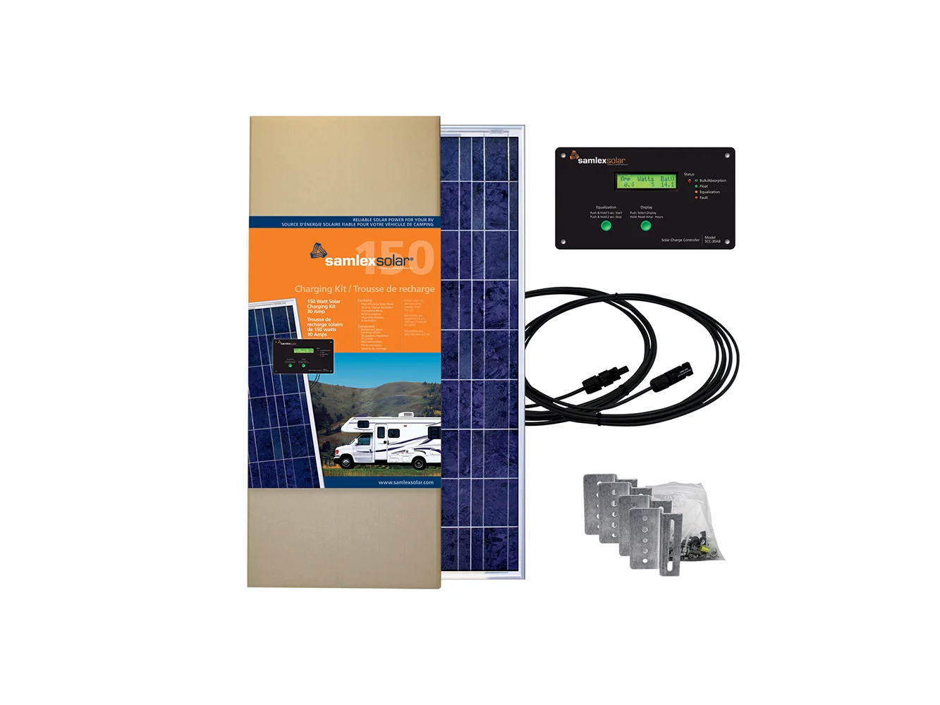 The Samlex SRV-150-30A Solar Charging Kit comes with a high efficiency 100 Watt solar panel, a 30 Amp charge controller, connecting wires and aluminum mounting brackets and hardware that can be used to secure the solar panel to the roof of your remote structure or vehicle, or any other flat surface.