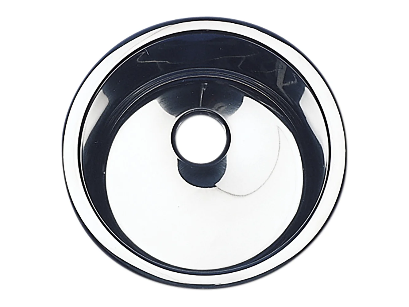 This is a cylindrical sink with a mirror finish, and it’s made of 18/10 stainless steel.