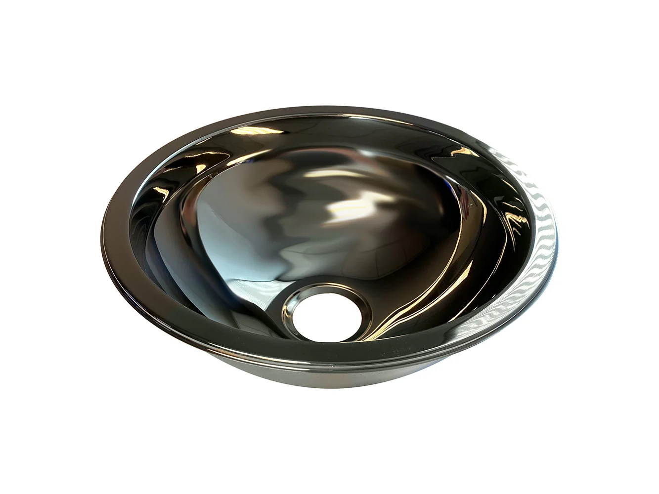 This basin sink has a mirror finish and is made of 18/10 stainless steel.