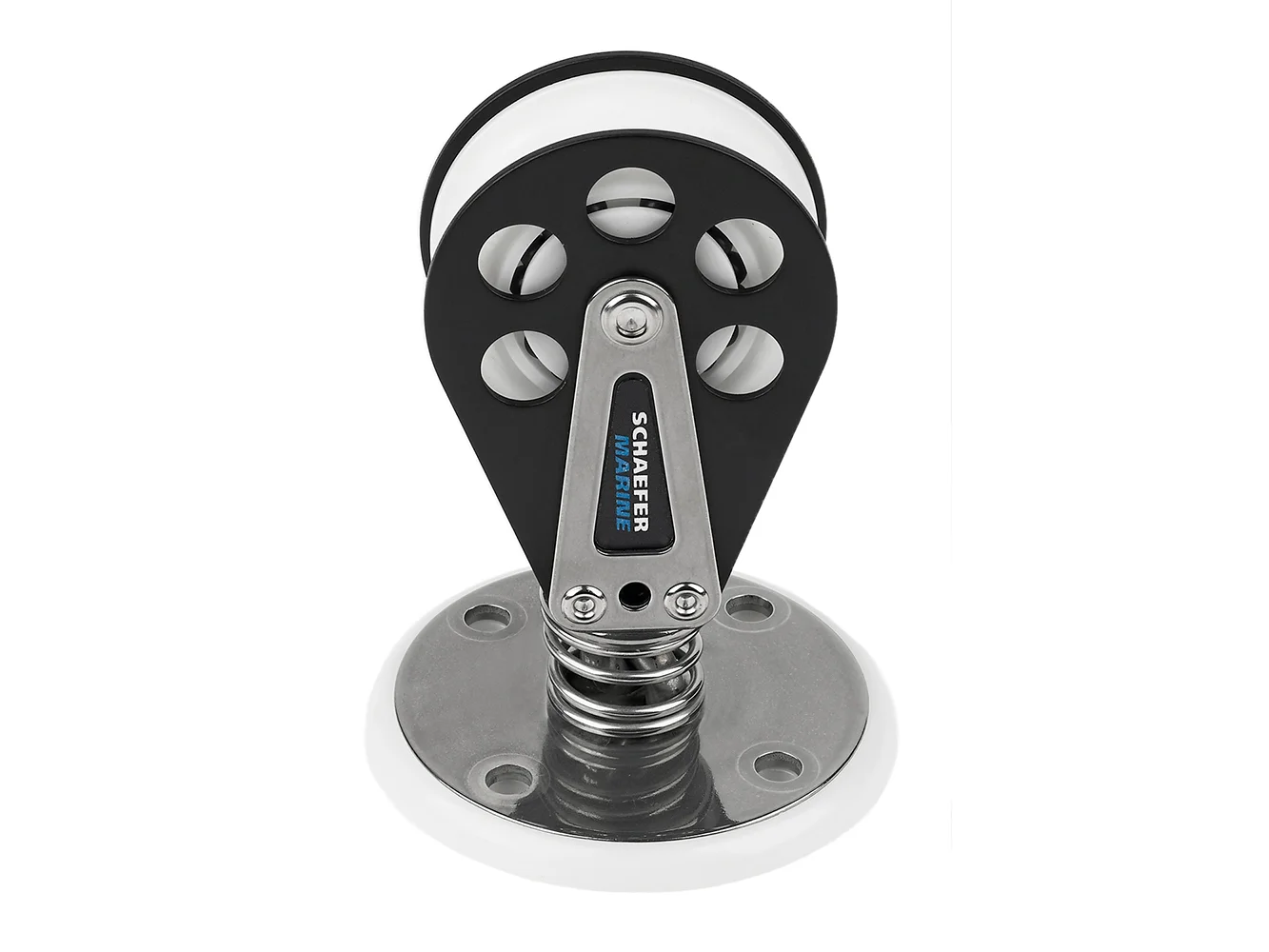 Single stand up ball bearing block. Stand up spring keeps block upright when not in use. Stainless steel base spreads load out and may be used with 97-49 backing plate. (sold separately) Delrin(tm) ball bearing sheave provides a low-friction high strength sheave. Sheave Dia. 2-2/8″ (60 mm), Max Line 1/2″ (13 mm), Dia. includes urethane base 3-3/8″ (86 mm), Height 4-25/32″ (120 mm), H2 2-15/32″ (63 mm), Fastener Size (4),1/4″ RH (6 mm), C/C 1-11/16″ (43 mm), SWL 1700 lbs (771kg), Weight Alum. 11.7 oz (332 g).