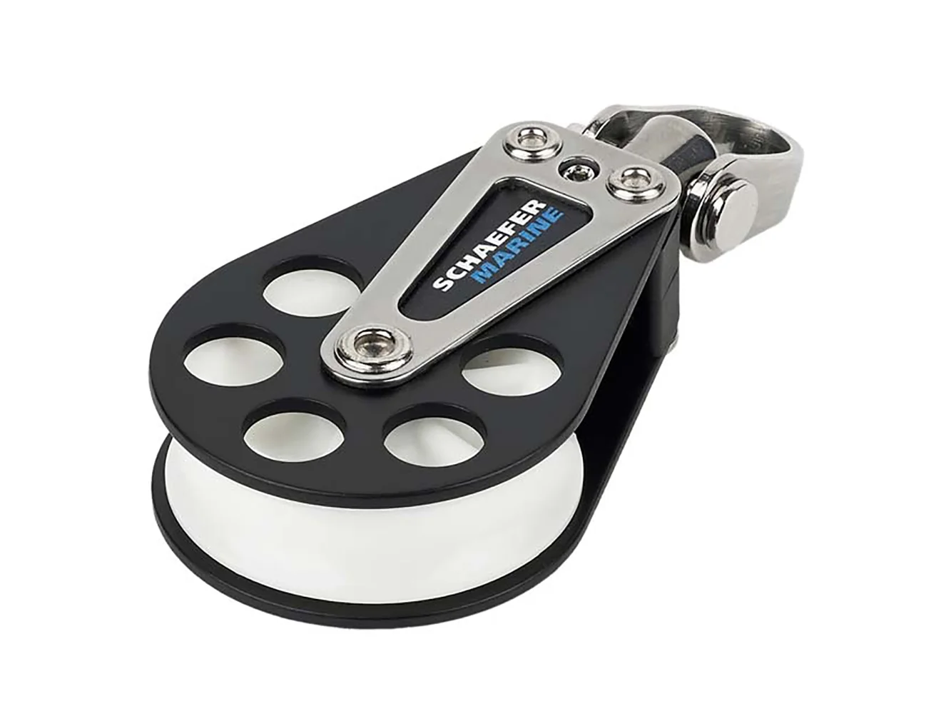 Single block with anodized aluminum cheeks. Delrin™ sheave ensures smooth operation with high safe working load. Swivel head may be locked in place to avoid twist.
