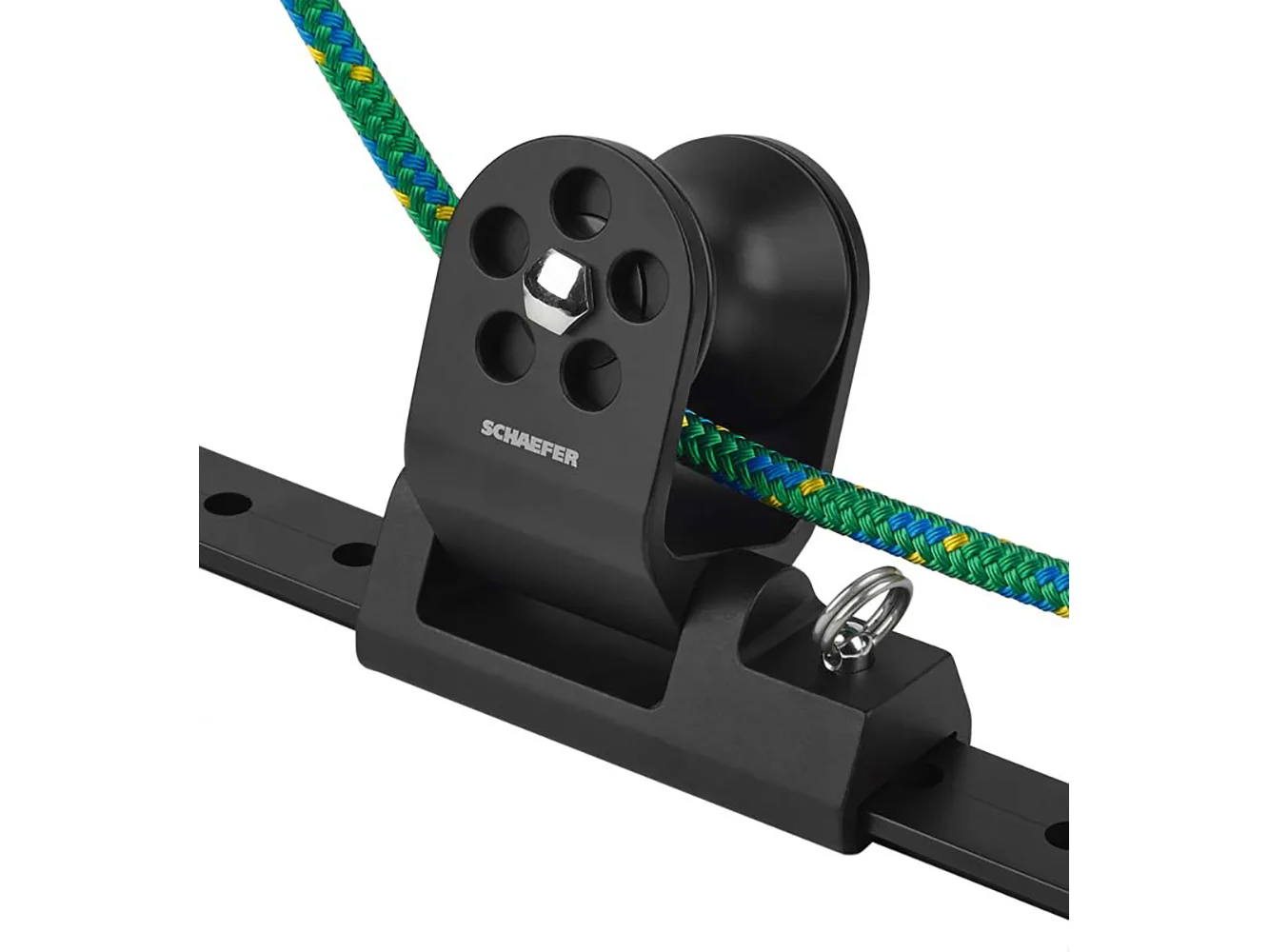 Hardcoat anodized aluminum body and slider provide a high strength block. Aluminum sheave runs on nomex™/Teflon™ bearing for a low-friction, high strength sheave. Articulating sheave allows for a proper lead. Pin stop makes adjustment simple.